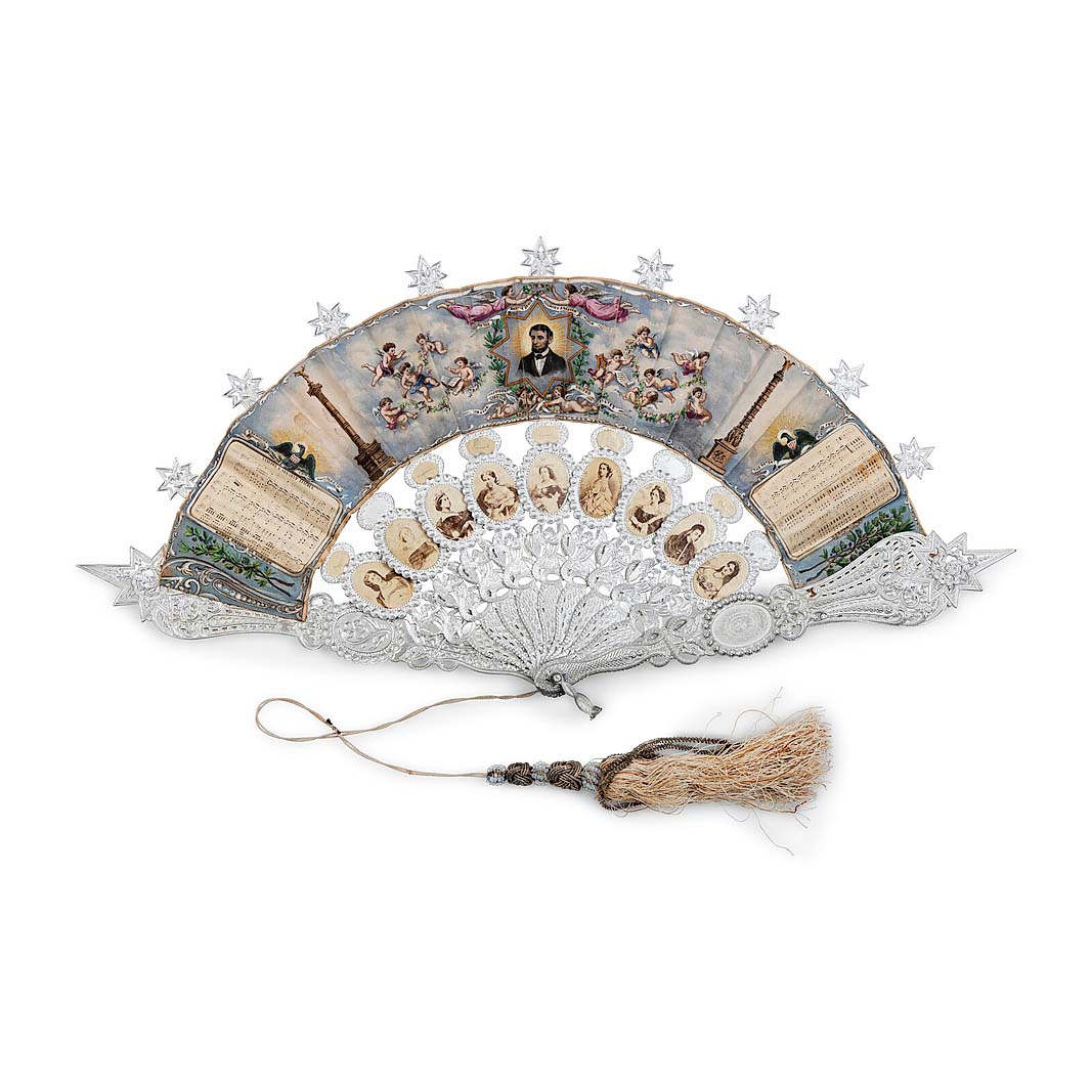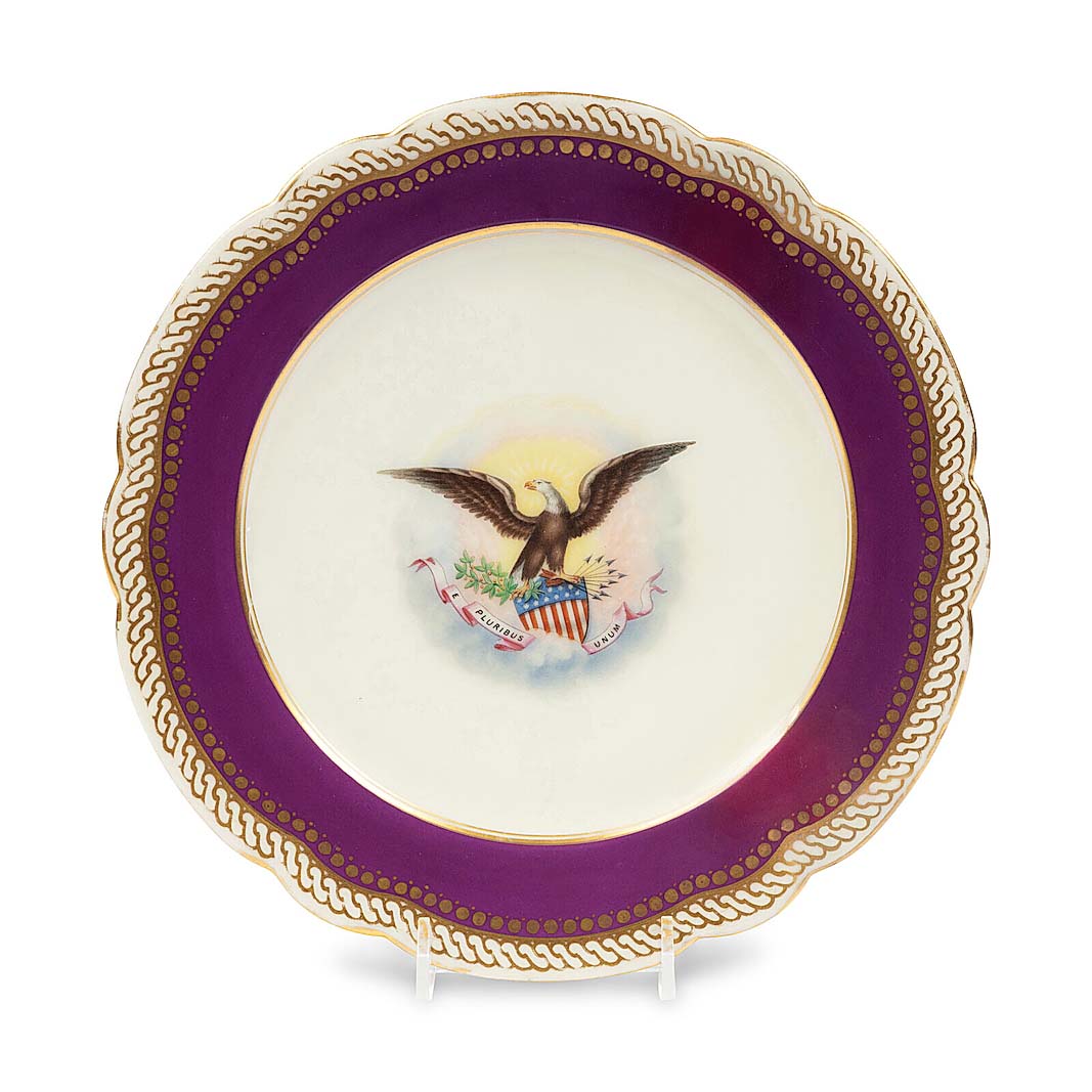 The 188-lot sale was led by memorabilia of the “Savior,” namely a 34-star eagle parade flag from the 1864 Lincoln and Johnson campaign, which achieved a new auction record. Made circa 1863-64 and considered “exceedingly rare” due to the limited amount of campaign material from Lincoln’s second run, the flag was paint-printed on cotton and depicted a wreath surrounding a large eagle and colored shield as well as the words “Lincoln and Johnson.” Surpassing its $50/100,000 estimate, the flag flew for $281,600 and was purchased by flag collector and antiques businessowner Jeff R. Bridgman.