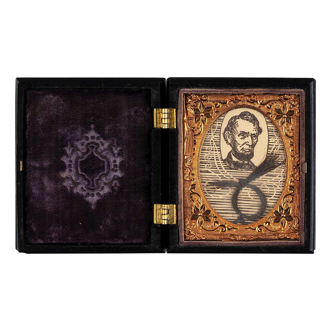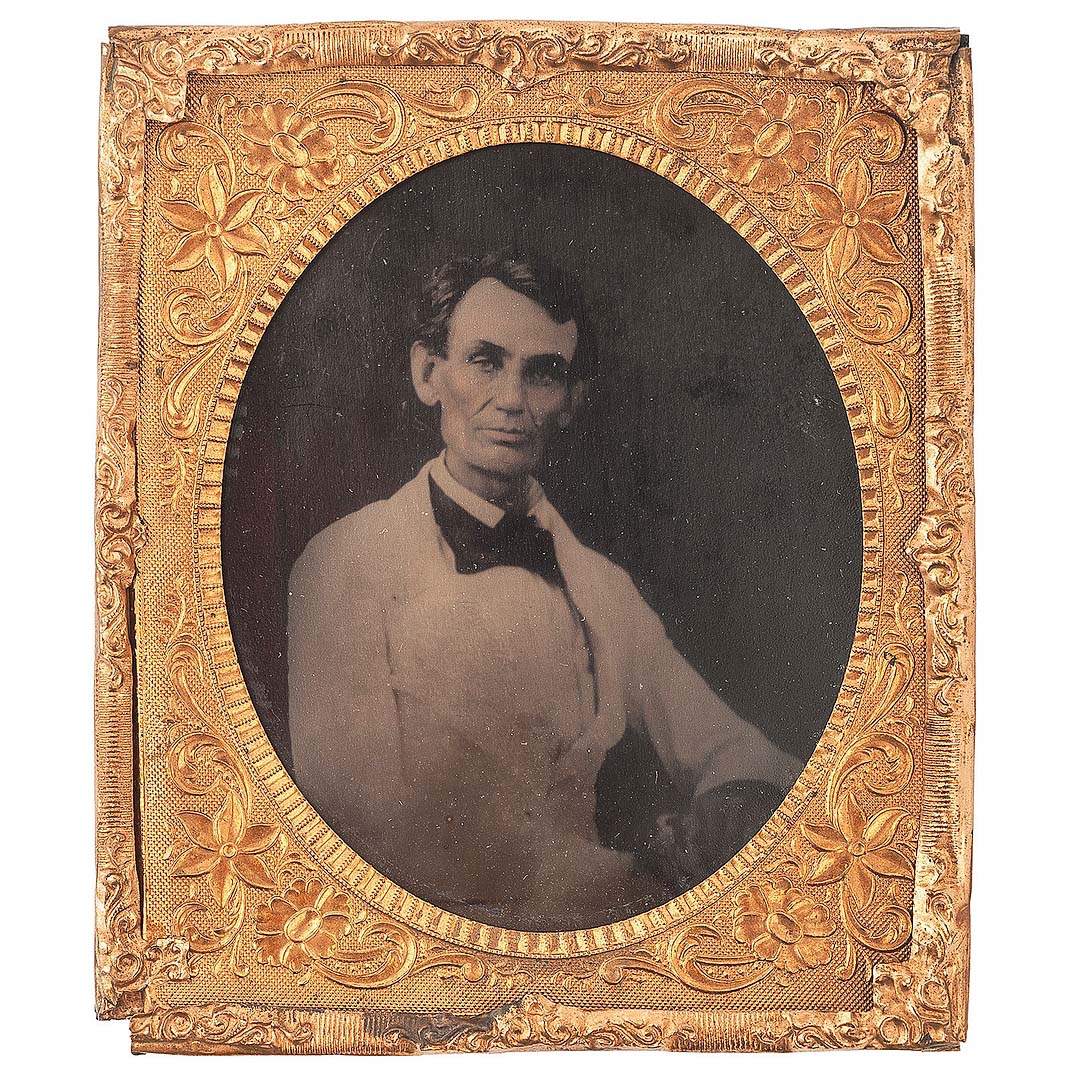 This rare period sixth plate tintype of lawyer Abraham Lincoln by Abraham Byers, 3½ by 3 inches, circa 1860, was referred to as the “Beardstown Portrait” and was bid to $76,800 ($15/20,000).
