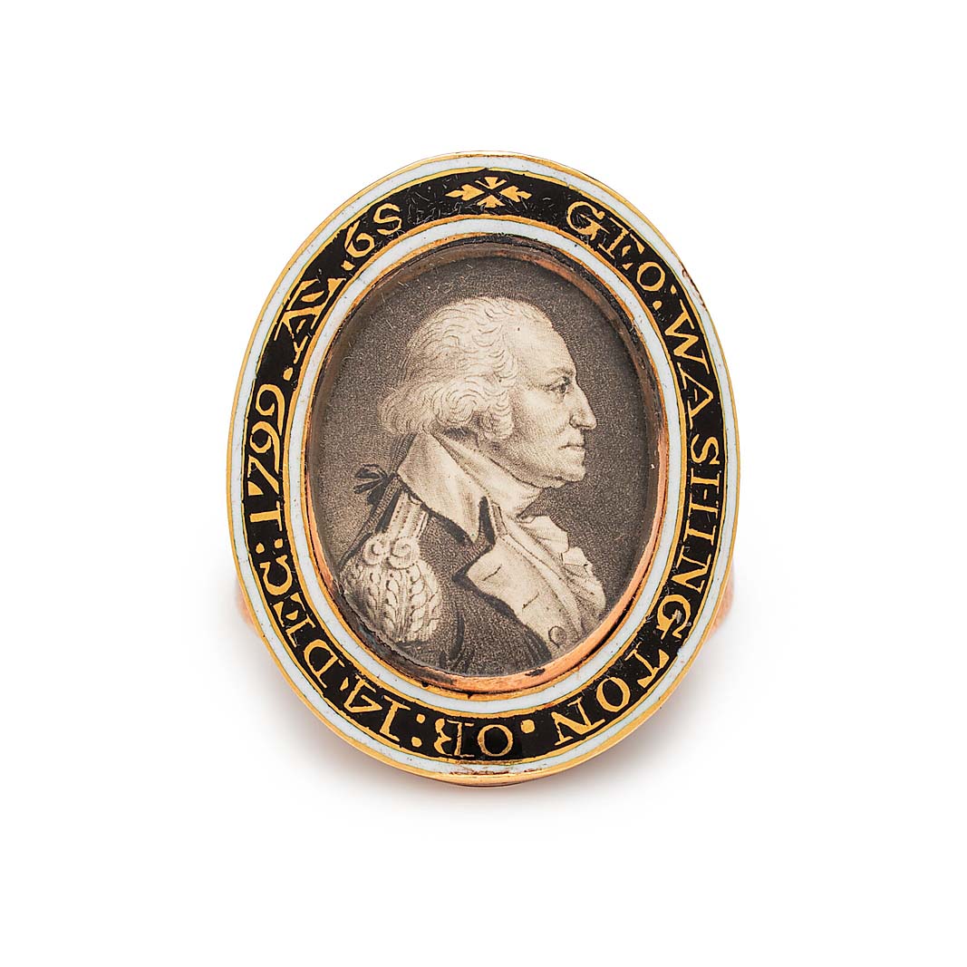This circa 1800 gold alloy and enamel mourning ring contained an oval glazed bevel featuring an image of George Washington in profile by Charles Balthazar Julien Févret de Saint-Mémin (1770-1852) and may be one of five rings bequeathed in the first president’s last will and testament. It achieved a new auction record at $70,400 ($15/20,000).