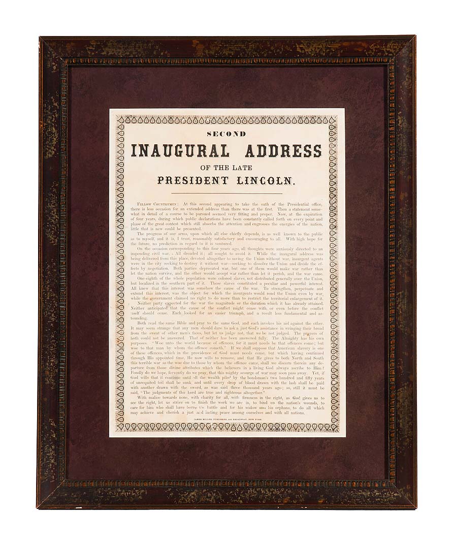 An engraved broadside of the “Second Inaugural Address of the Late President Lincoln,” printed by James Miller (New York City) in 1865, also made waves with bidders, as Brink noted. “Additional surprises reinforced the market’s competitiveness, including a modestly estimated lot that realized $70,400 against a $2/3,000 estimate. Strong bidding activity was concentrated across phone and online platforms, reflecting an engaged and highly motivated domestic audience.”