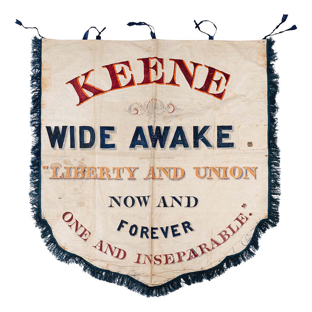 Bridgman was also the lucky winner of a Lincoln-Hamlin campaign banner from the New Hampshire Wide Awakes circa March of 1860. “The Wide Awakes were a grassroots Republican phenomenon that emerged during the presidential campaign of 1860, giving public and highly visible expression to Northern opposition to the expansion of slavery,” catalog notes explained. The 47-by-42-inch shield-shaped silk banner was hand-painted and double-sided, with blue fringe around its edges and silk ties and eyelets on its top edge at the corners. The obverse of the banner read “Keene Wide Awake. ‘Liberty and Union Now and Forever One and Inseparable,’” while the reverse read “‘Let Us Have Faith that Right Makes Might.’ A. Lincoln.,” taken from Lincoln’s 1860 Cooper Union Address.