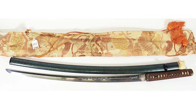 Also earning top prices were a katana with a 26-inch-long blade and Japanese writing on its wooden scabbard ($12,600) and a 38½-inch-long example with a black woven handle and two menuki which could possibly be attributed to swordsmith Ko Yoshii ($10,800).