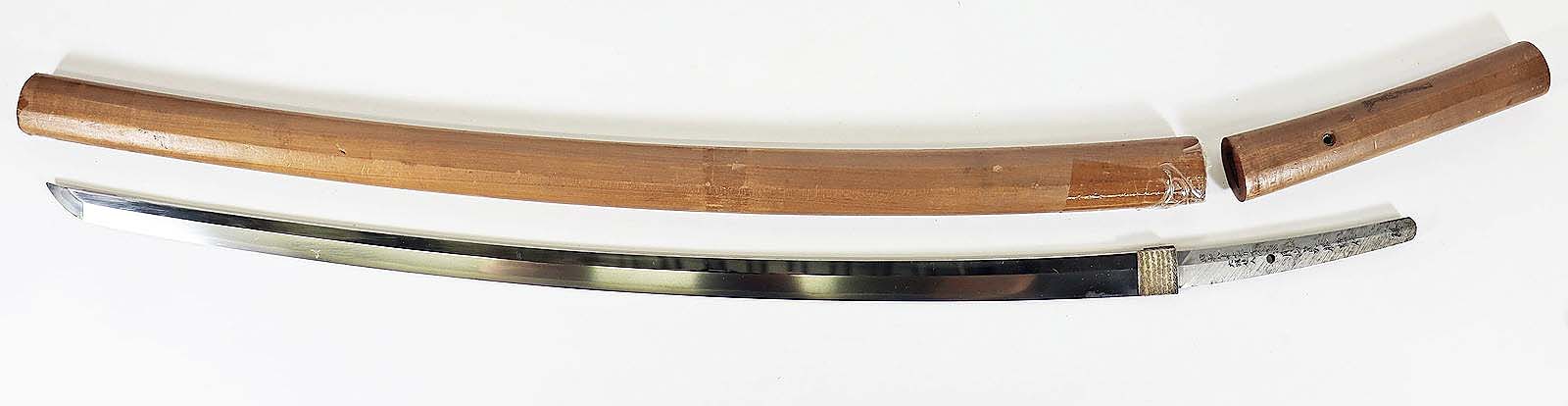 Attributed to swordsmith Gassan Sadakutsu, this katana with a wooden handle and scabbard, 26¾ inches long (blade), was sliced down for $19,200.