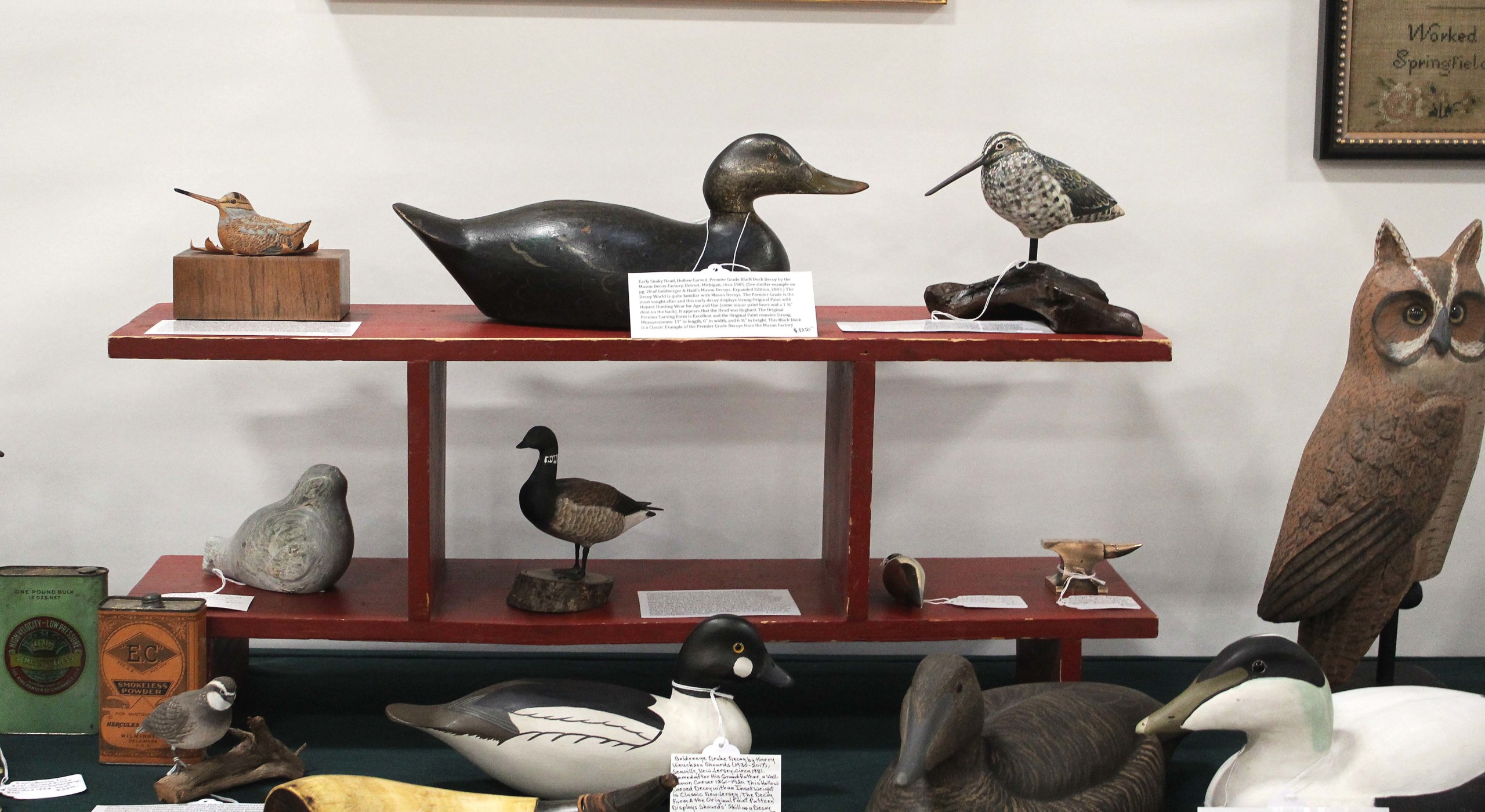 Raven’s Way Antiques, North Kingstown, R.I., assembled a nice collection of vintage decoys, including an early (circa 1905) hollow snakey-head premier-grade black duck by the Mason Decoy Factory that retained strong original paint despite its use. A pair of contemporary hollow eider decoys with slightly turned heads by Mike Smyser Decoys (Mount Wolf, Penn.) also turned shoppers’ heads.