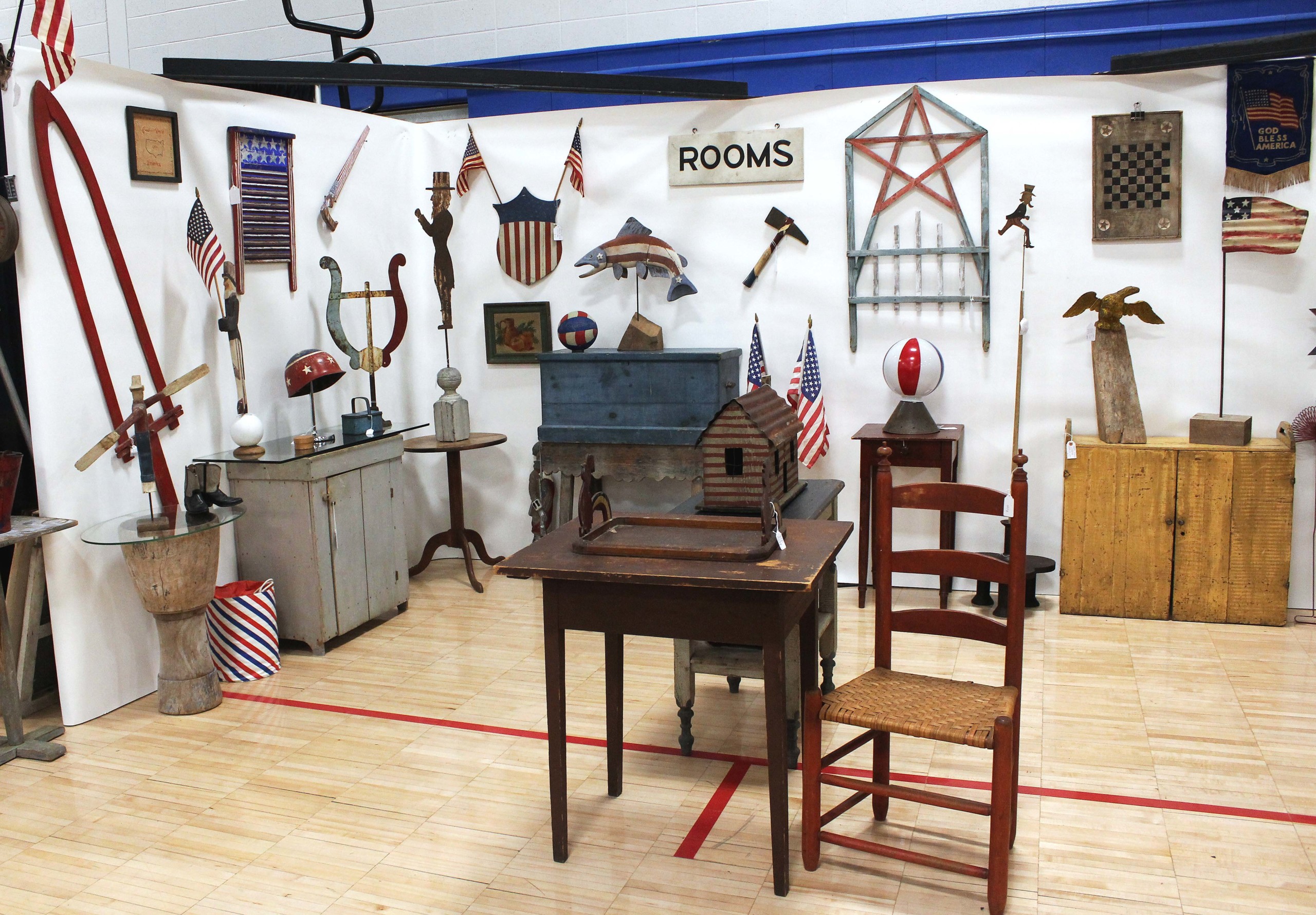 While there was a predominantly country aesthetic throughout the show, offerings were diverse and ranged from woodenware to metal items to ceramics, toys and more. New England Home Antiques of Wethersfield, Conn., featured a large vintage rooster wall hanging, probably from a carnival or merry-go-round, as well as a primitive oil on canvas landscape of a northern New England or Upstate New York scene, circa 1870-80, in a lemon gold frame.