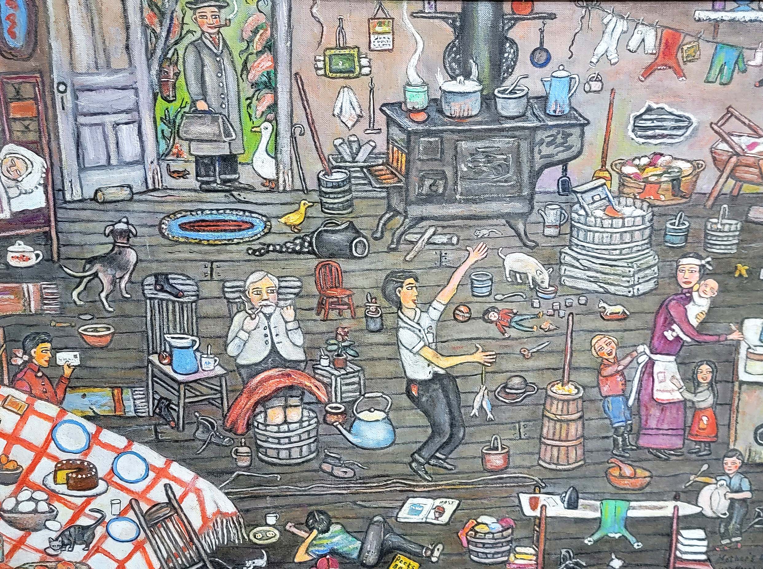 Pairs of objects in the exhibition resonate with one another. A fraktur birth certificate by the Flowering Vine Artist, eastern Ohio, dated 1812 with its text in German, and a Quaker sampler by Marie Mendhenhall, Warren County, Ohio, 1832 with its text in English, suggest, simultaneously, the diverse immigrant cultures that came to Ohio and the transformation of those cultures over time. Similarly, two paintings, “View of Marietta, Ohio” by Sala Bosworth (1805-1889), circa 1835, and “Mother’s Day” by Leuty McGuffey Manahan (1889-1977), painted in the mid Twentieth Century, present aspects of the American artistic spirit in what is perhaps a distinctly Ohio key. Bosworth is an example of the classic early Nineteenth Century American itinerant painter who made his living painting portraits and landscapes. “View of Marietta, Ohio” has some of the folk art geometry typical of such artists in a scene that exudes prosperity, abundance and order. Still, despite the high summer in the landscape, the vista is almost too perfect, and the palette suggests autumn in the red dirt of the eroded and ploughed land. At first glance, Bosworth appears to be anticipating the agricultural surreal — a century early — that would emerge in Benton, Wood, Cone and Curry, and erupt thereafter throughout the Midwest. By virtue of her self-taught naïveté — or apparent naïveté — Leuty McGuffey Manahan has been called the Grandma Moses of the Midwest, or of Ohio. However, look at “Mother’s Day” without knowing that, or anything about her, and you will note a supreme irony and sense of humor found nowhere in Grandma Moses’s New England bucolics. First, it isn’t “Mother’s Day,” the holiday, that Sunday in May when we serve our wives and mothers with earnestly but badly made waffles in bed or take her to stand in line for brunch, complete with watery mimosa. No, it’s mother’s day, her day, any day, every day, a chaos of hyperactive, proliferating children, shoes, toys and stuff everywhere, and dad arriving home to it all, smoking his pipe and looking like he’s ready for his slippers and supper. Supreme irony. Not Grandma Moses at all.