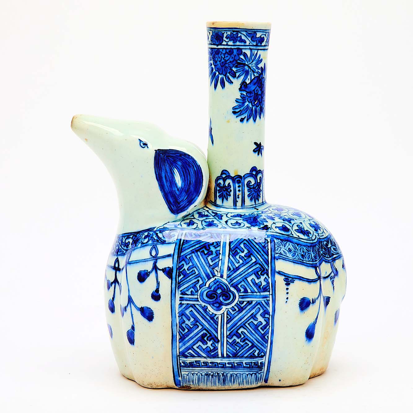 Taking inspiration from Chinese blue-and-white porcelain, an elephant-form kendi from Safavid Iran (1501-1736) also impressed bidders. A similar object is at the Metropolitan Museum of Art in New York City, though the museum’s example, unlike Chinese porcelain originals, is made of stonepaste. The elephant kendi from the Hills collection had vibrant cobalt details with ruyi-head, key-fret and floral motifs; it reached $21,760.