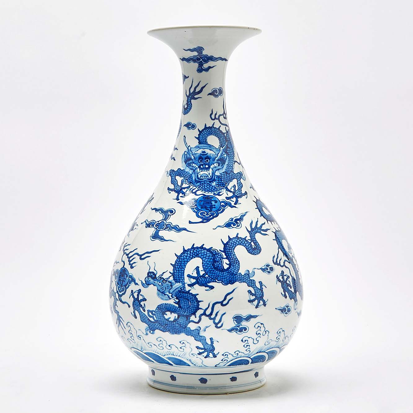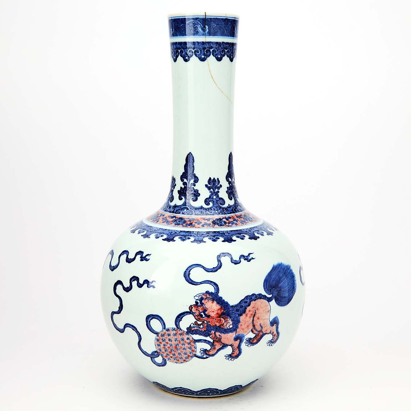 This Chinese blue-and-white vase with red lion accents, 15 inches tall, had a Qianlong (1736-1795) seal mark and was possibly of the period; it realized $152,900 ($2/4,000).