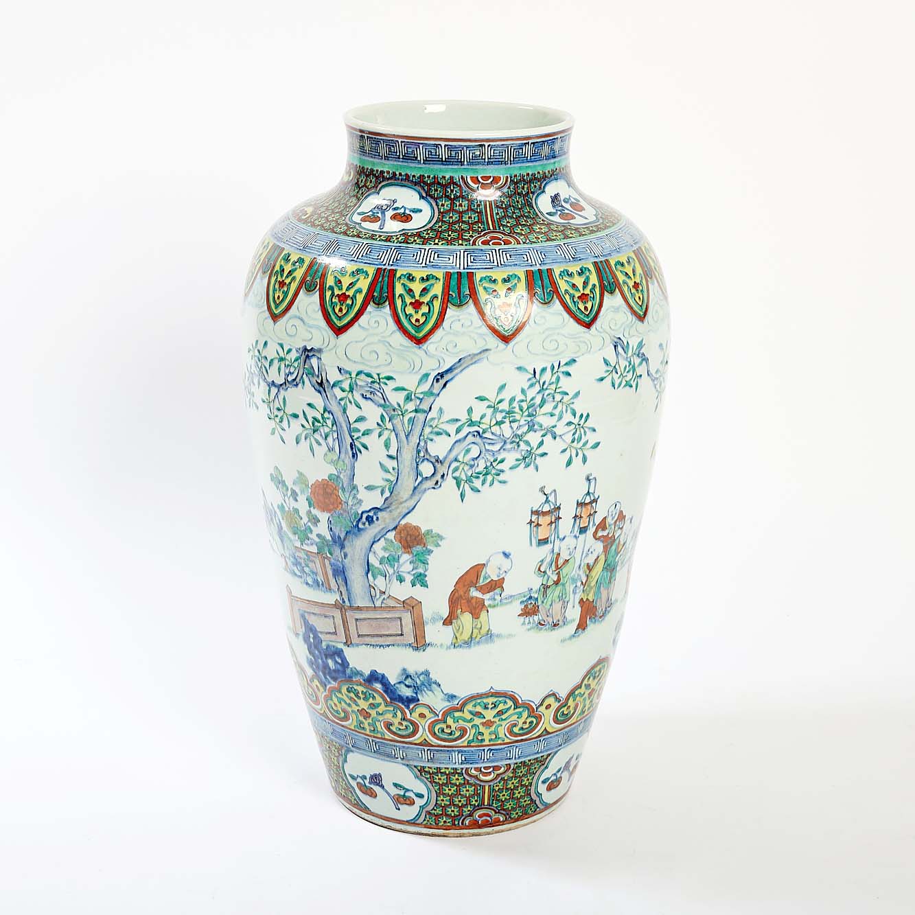 Standing 30½ inches tall, this large Chinese doucai porcelain vase depicting boys at play in a garden, Nineteenth-Twentieth Century, also brought a large price: $95,750 ($5/7,000).