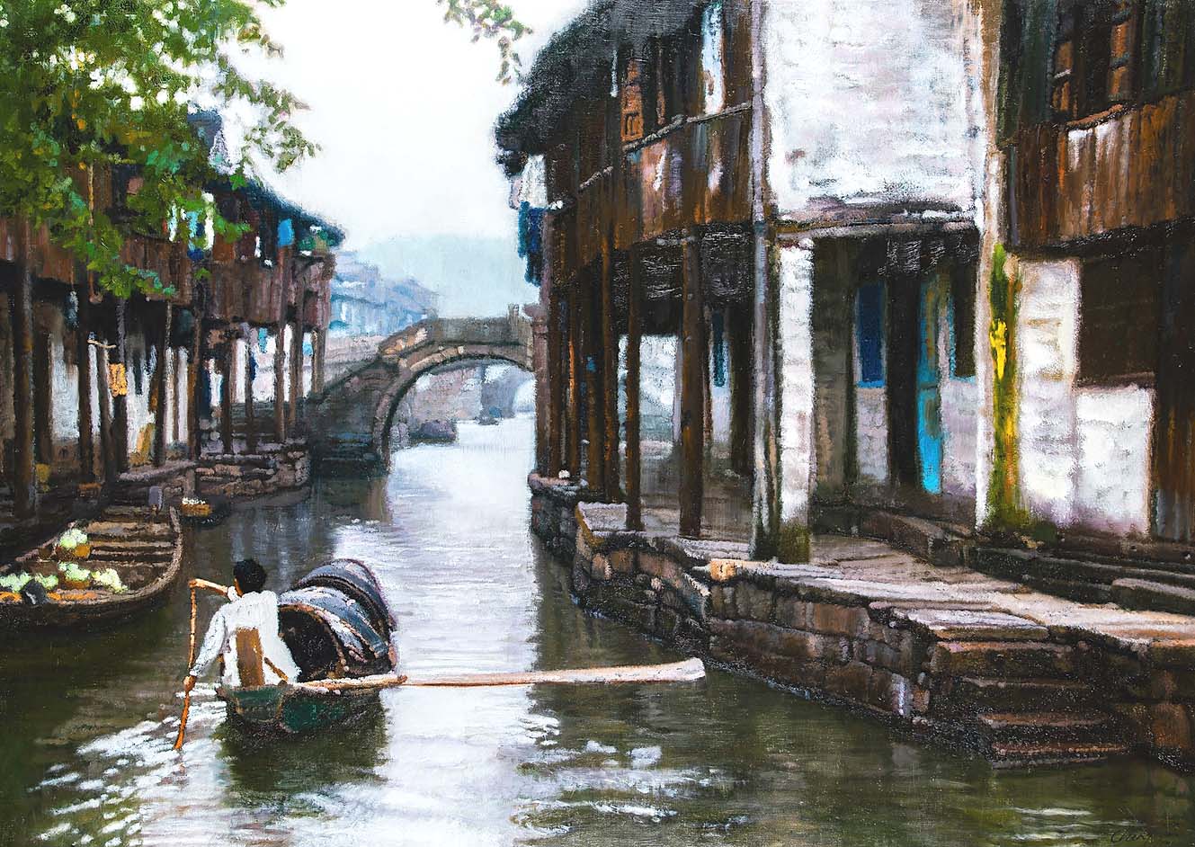 Modern Chinese painter Chen Yifei (1946-2005) was represented by his 1984 oil on canvas “Start of the Day (Suzhou),” which measured 30 by 42 inches and realized $95,750 ($20/30,000).