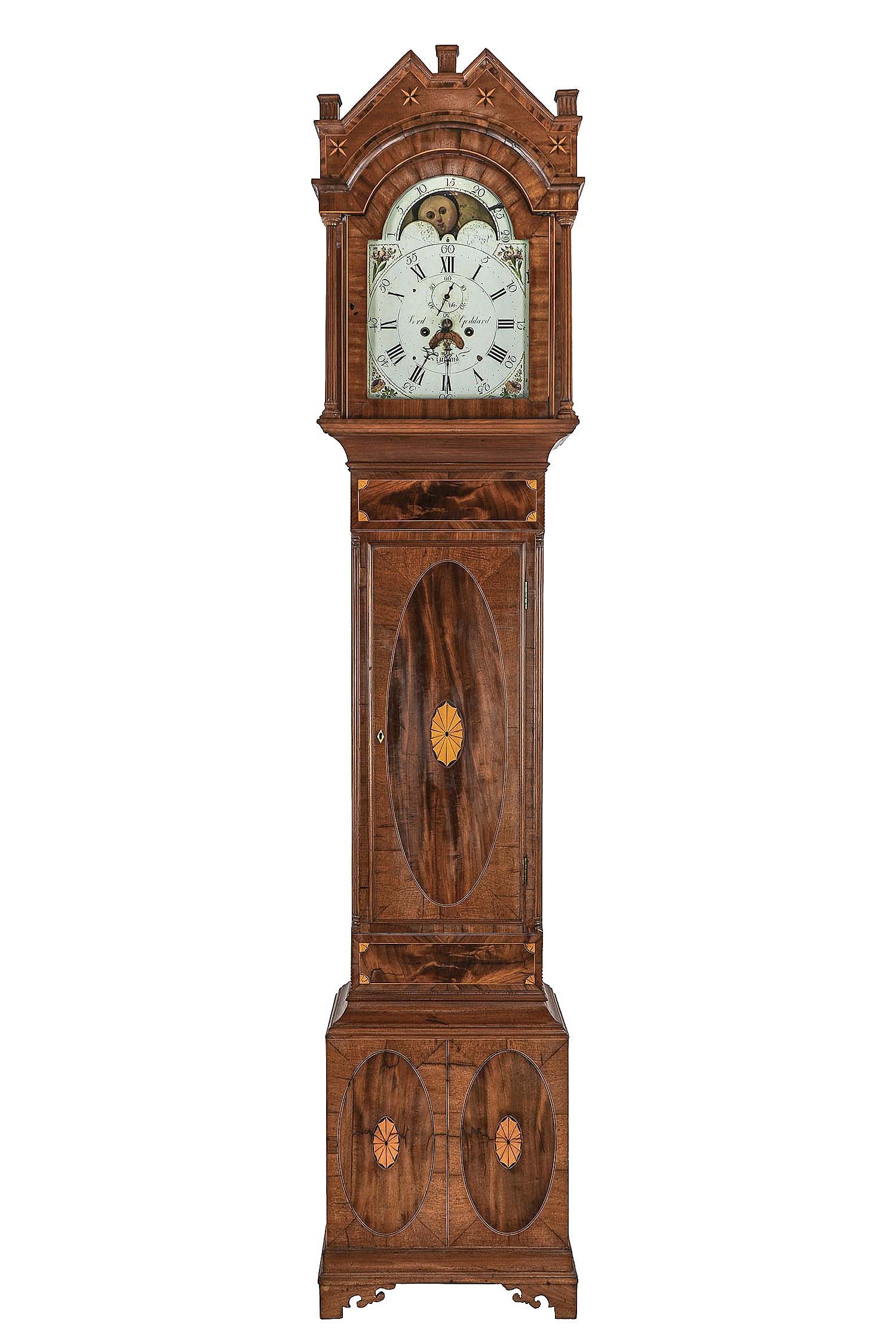 WILLISTON, VT. — A Federal period inlaid Lord & Goddard (Rutland, Vt.) tall case clock crossed the block for $16,640, including buyer’s premium, becoming the highest-priced lot in the January 9 Americana & Fine Art auction conducted by Merrill’s Auctioneers & Appraisers. The 503-lot sale featured an abundance of fresh-to-market pieces of period Americana, including country furniture, folk art, accessories, paintings, Oriental carpets, silver, jewelry and porcelains, from collections and institutions in Vermont, Massachusetts and New York. The Lord & Goddard clock came from a Charlotte, Vt., home, had brass works, showed the moon phase and was signed on the dial. The clock, model number 66, was purchased from Doyle, New York City, in 2001 and stood 92 inches tall. Additional results from the auction will be featured in an upcoming edition.