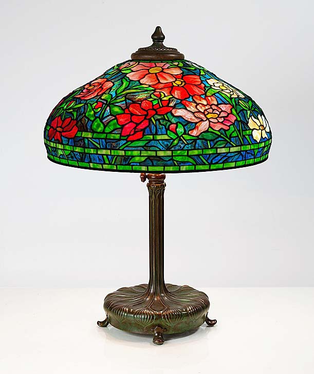 Having a 22-inch shade, this circa 1910 Peony table lamp from Tiffany Studios, 32 inches tall, was lit to $201,300 ($125/175,000).