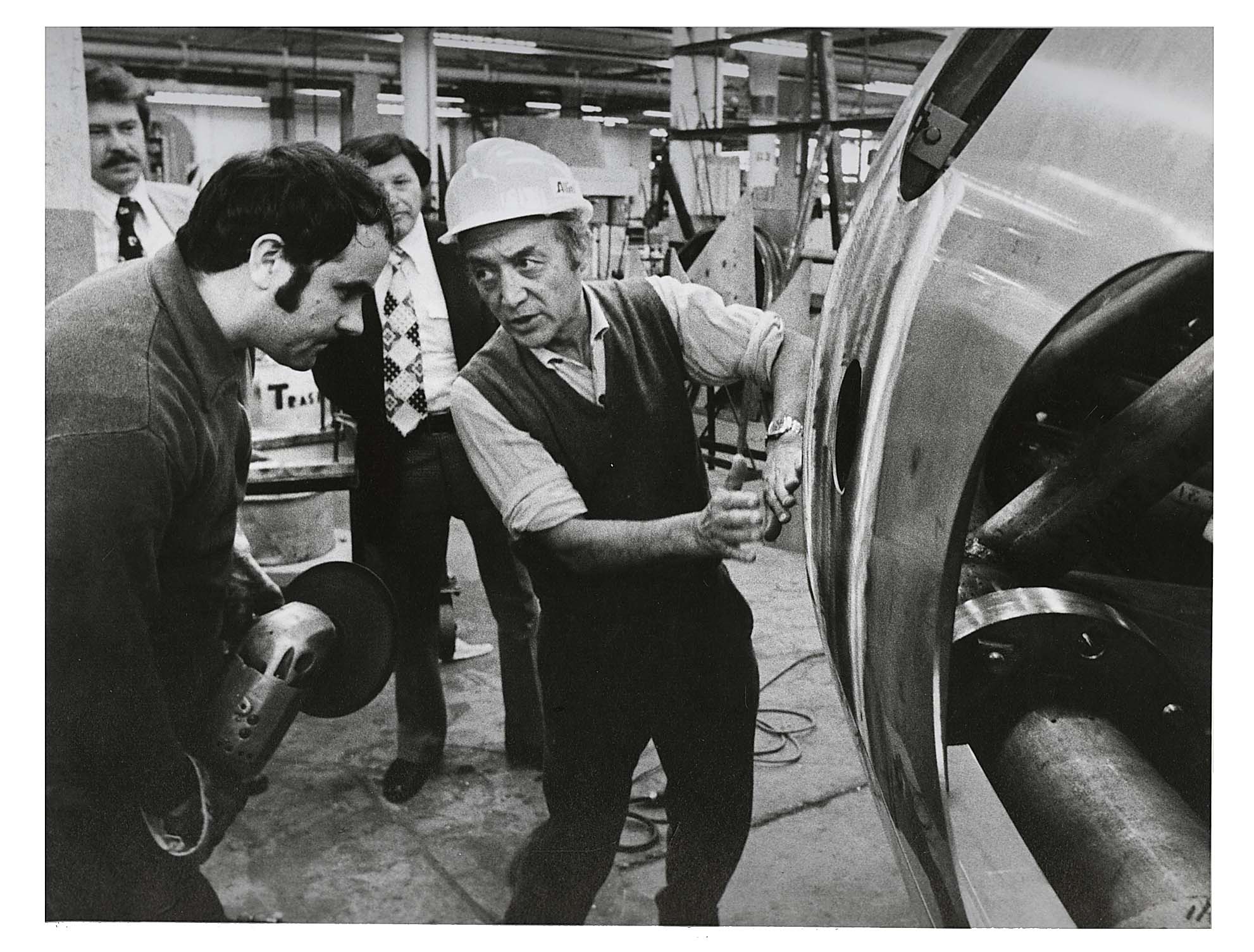 Isamu Noguchi working on the Horace E. Dodge Fountain for Philip A. Hart Plaza at Allied Bronze, Queens, N.Y., 1974-75. The Noguchi Museum Archives, 04034.