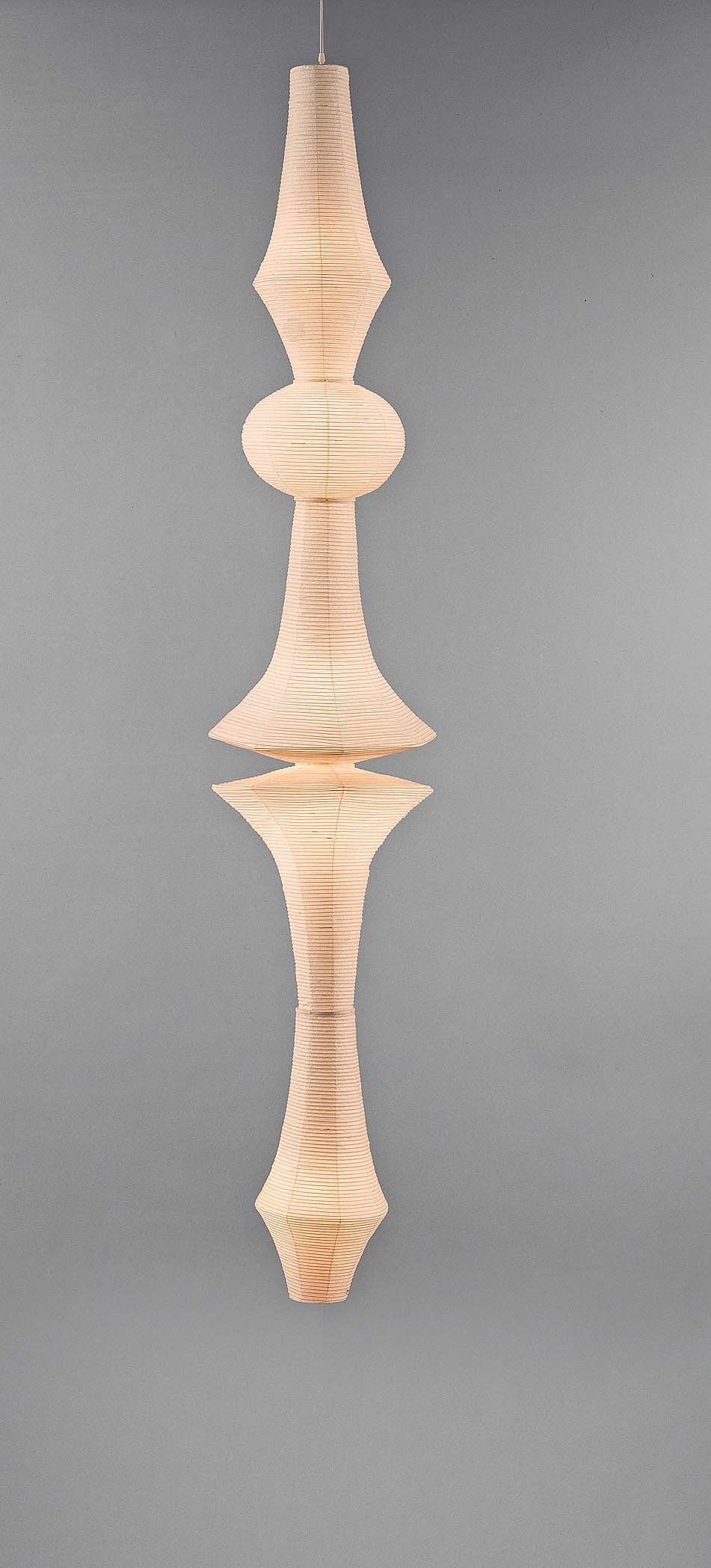 “Akari (model E)” by Isamu Noguchi, fabricated by Ozeki & Company, Ltd (established 1891), designed 1951-54, manufactured beginning 1954, mulberry bark paper, bamboo and wire. The Isamu Noguchi Foundation and Garden Museum, New York. The Noguchi Museum Archives, 152735. Photo by Kevin Noble. © 2025 The Isamu Noguchi Foundation and Garden Museum, New York / Artists Rights Society (ARS), New York.