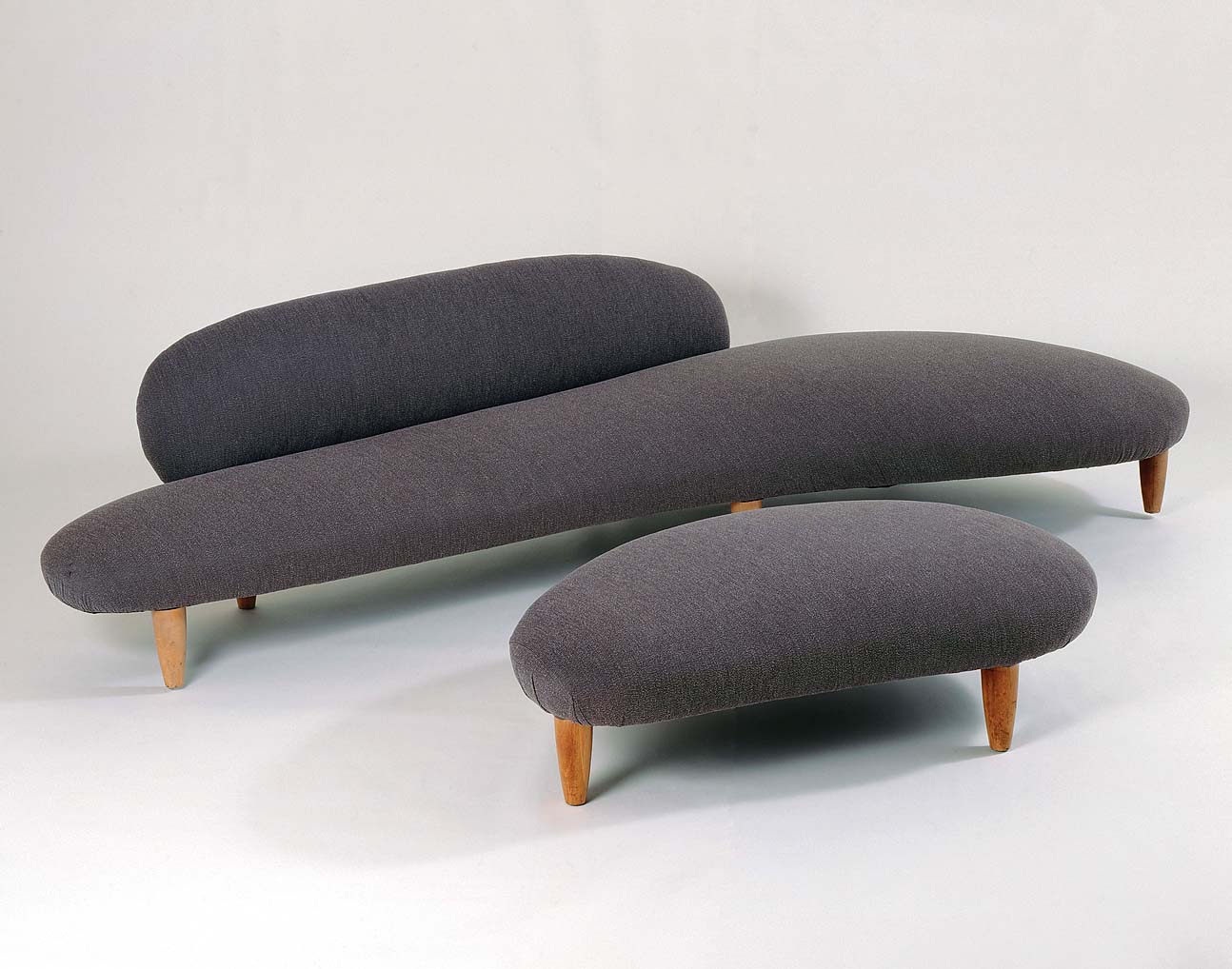 Couch (IN-70) and Bench (IN-71) by Isamu Noguchi, manufactured by Herman Miller Furniture Company (established 1923), designed 1948-49, made 1949-51, wood, maple laminate and replaced cotton upholstery. Milwaukee Art Museum, gift of Gilbert and J. Dorothy Palay. Photo by Efraim Lev-er. © 2025 The Isamu Noguchi Foundation and Garden Museum, New York / Artists Rights Society (ARS), New York.