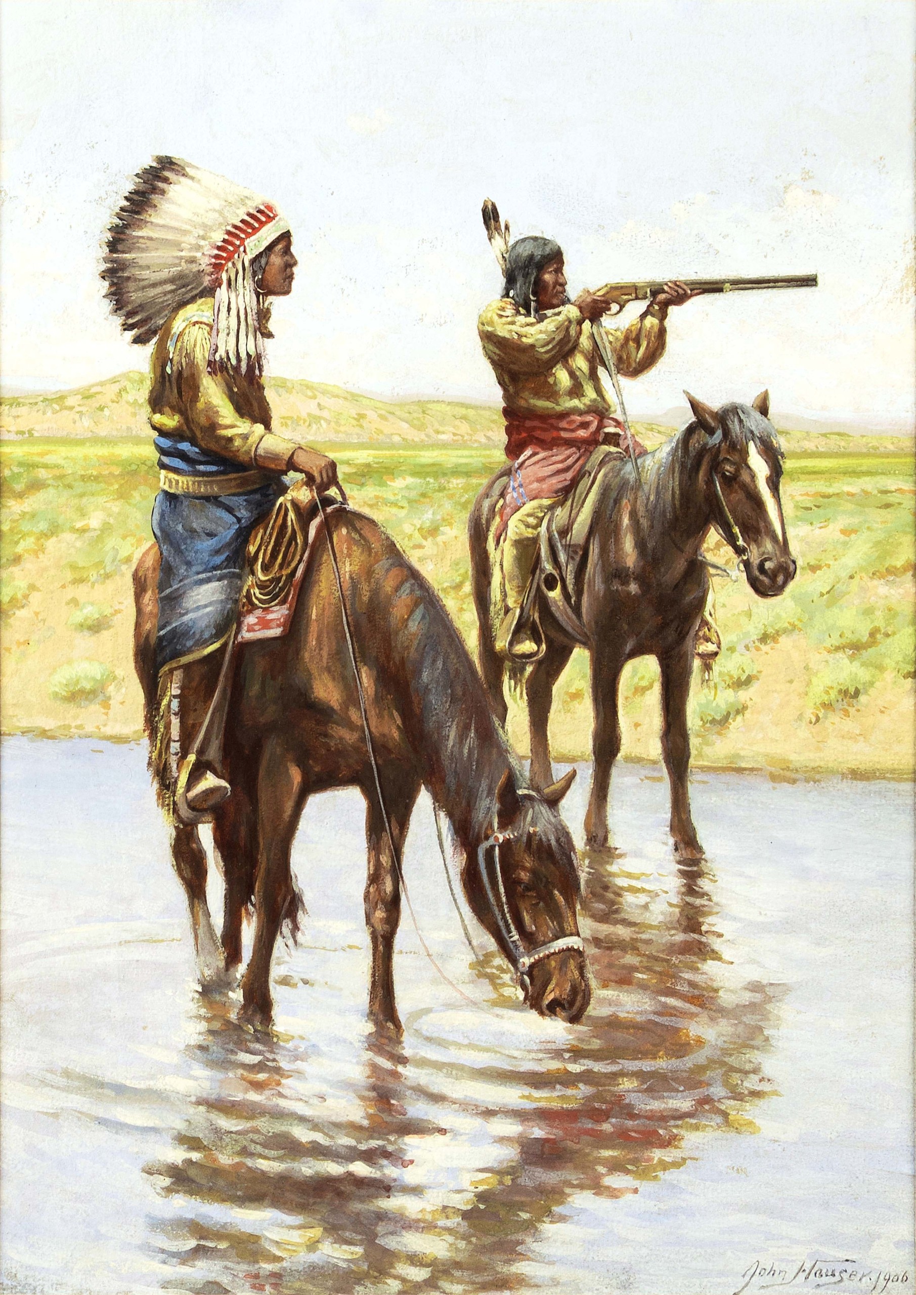 Works with Indigenous subjects were a strong collecting interest, as several other lots in the category brought above-estimate prices. Finishing for $33,000 on a high estimate of $25,000 was “Another Shot” by John Hauser. The 1906 gouache on paper, which showed two natives on horseback, was signed and dated to the lower right and was included in Edward Paxton Harris and Jerry Glenn’s Straight White Shield: A Life and Works of John Hauser (1859-1913) (Bellevue, Ky., MicroPress, Inc, 2012).
