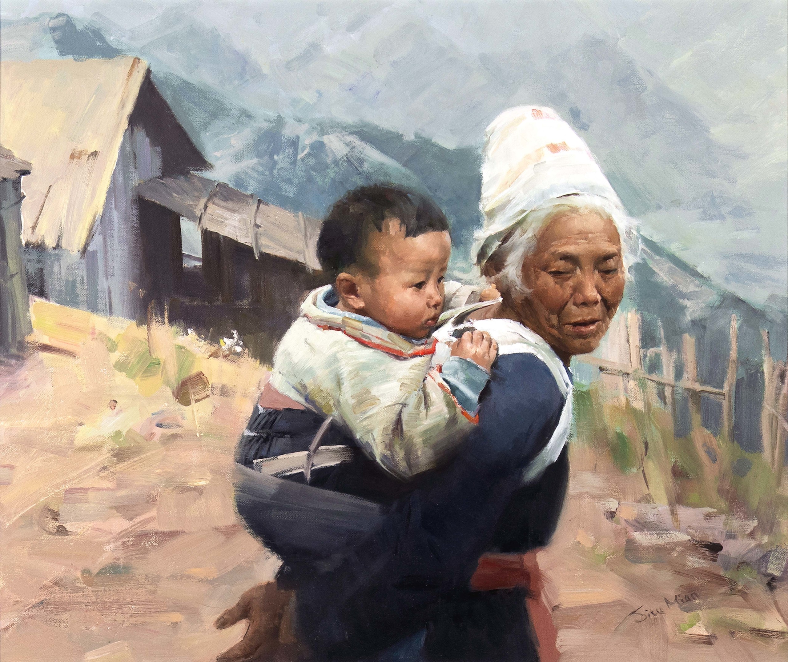Mian Situ (Chinese-American, b 1953 painted this 30-by-34-inch framed “Mother and Child” scene in oil on canvas. It brought $7,200 ($1,5/2,500).