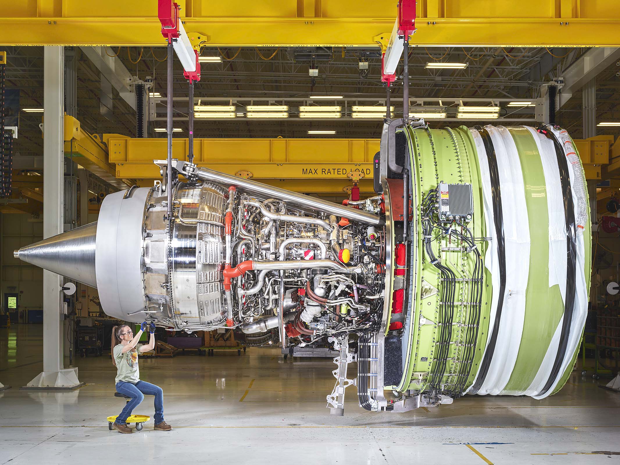 “GE90 jet engine being prepped for testing,” 2023 photograph by Christopher Payne, GE Aerospace Peebles Test Operation (Peebles, Ohio). Courtesy of the artist and ©Christopher Payne/Esto.