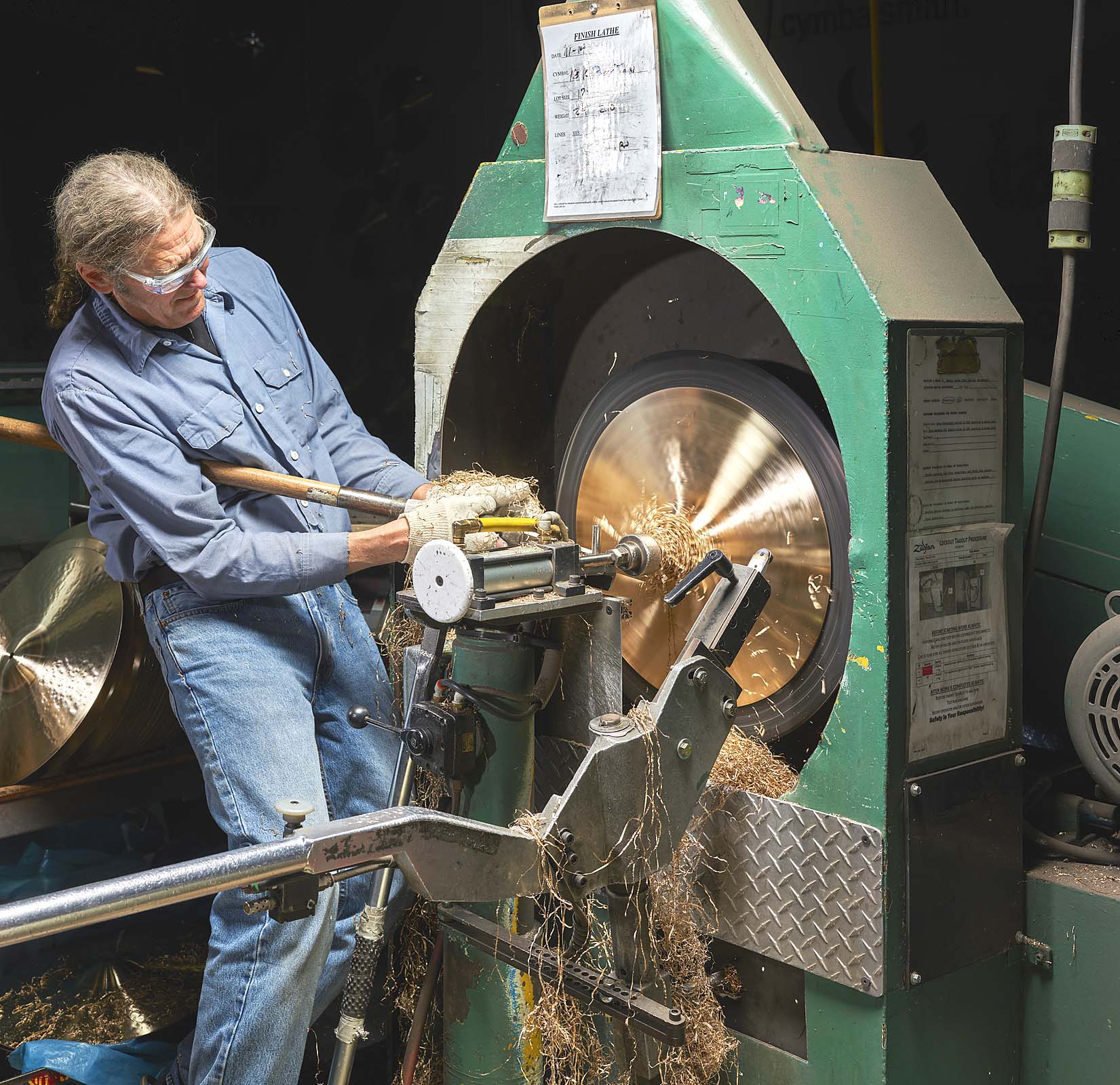 “Shaping a cymbal on a lathe,” 2024 photograph by Christopher Payne, Avedis Zildjian Factory (Norwell, Mass.). Courtesy of the artist and ©Christopher Payne/Esto.
