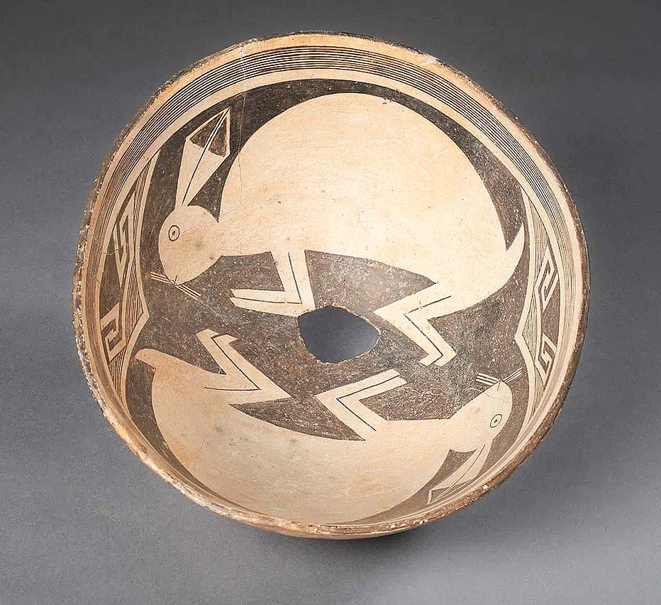 SANTA FE, N.M — A Mimbres black-on-white bowl led Taos Auction Company’s spring sale of Native American, Pre-Columbian, Tribal and fine art on April 2. Estimated at $4/6,000, the circa 1000-1130 CE hand-coiled bowl made $30,000. Having a rounded base and gently flaring rim, the bowl featured painted decoration of two rabbits around a central kill hole. Kill holes, common to Mimbres pottery in the Southwest, were thought to be made to release the spirit when the bowls were placed at gravesites. A complete report on the auction will appear in an upcoming issue.