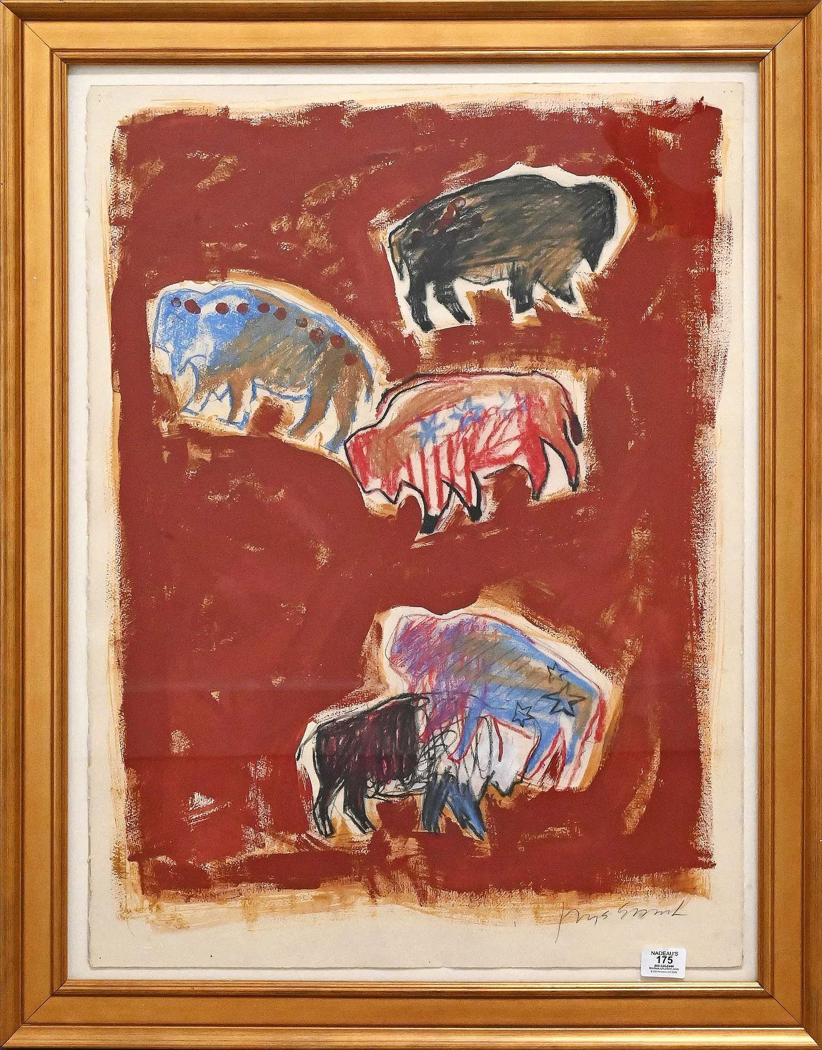 “American Bison,” a mixed media on paper, by Indigenous artist Jaune Quick-To-See Smith (Salish-Kootenai, 1940-2025) went within estimate at $12,540. The energetic work featured a composition of stylized buffalo outlined in bold, gestural marks and layered in color against a saturated red ground.