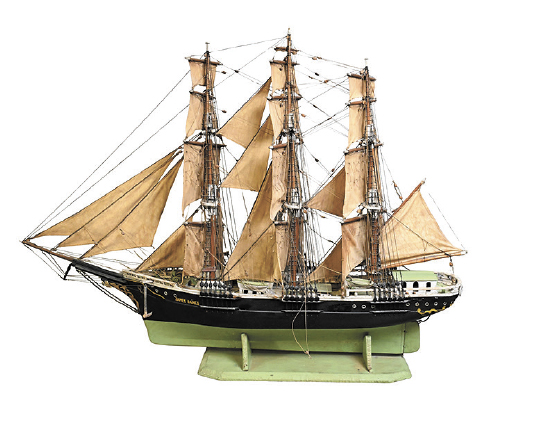 Three of the folk art pieces depicted ships in differing manners, including a watercolor on paper of a sailing American vessel rounding a coastline with a fortress in the foreground ($832), a 1930s handmade catboat weathervane with a painted wooden hull and copper and brass mast and sail ($512) and an all wood whaling barque model which measured 22 inches long ($512).
