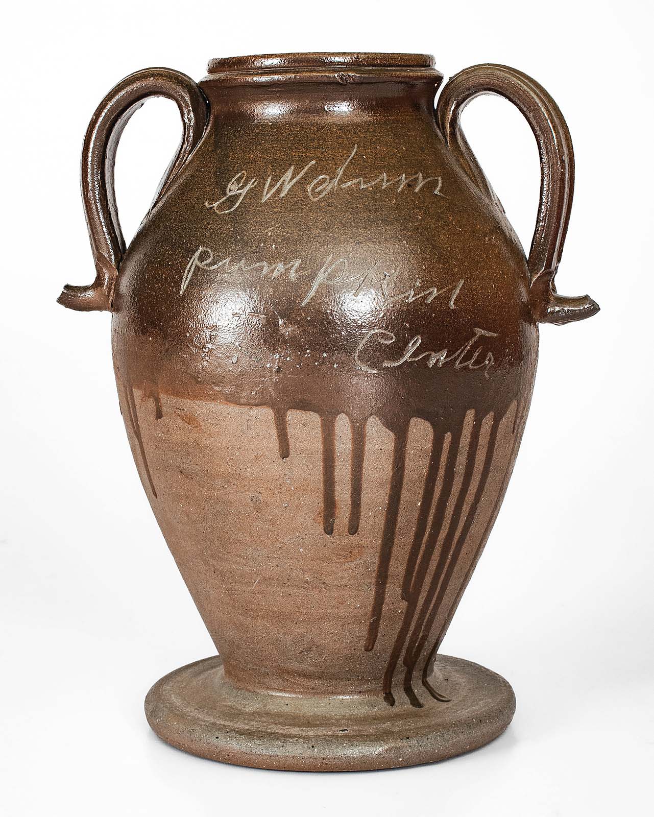 This salt-glazed stoneware vase with dipped slip decoration, inscribed “I Want you for / My Master” and “AHD,” signed “GW dunn / Pumpkin / Center,” more than tripled its $6/10,000 estimate to hit $36,000.