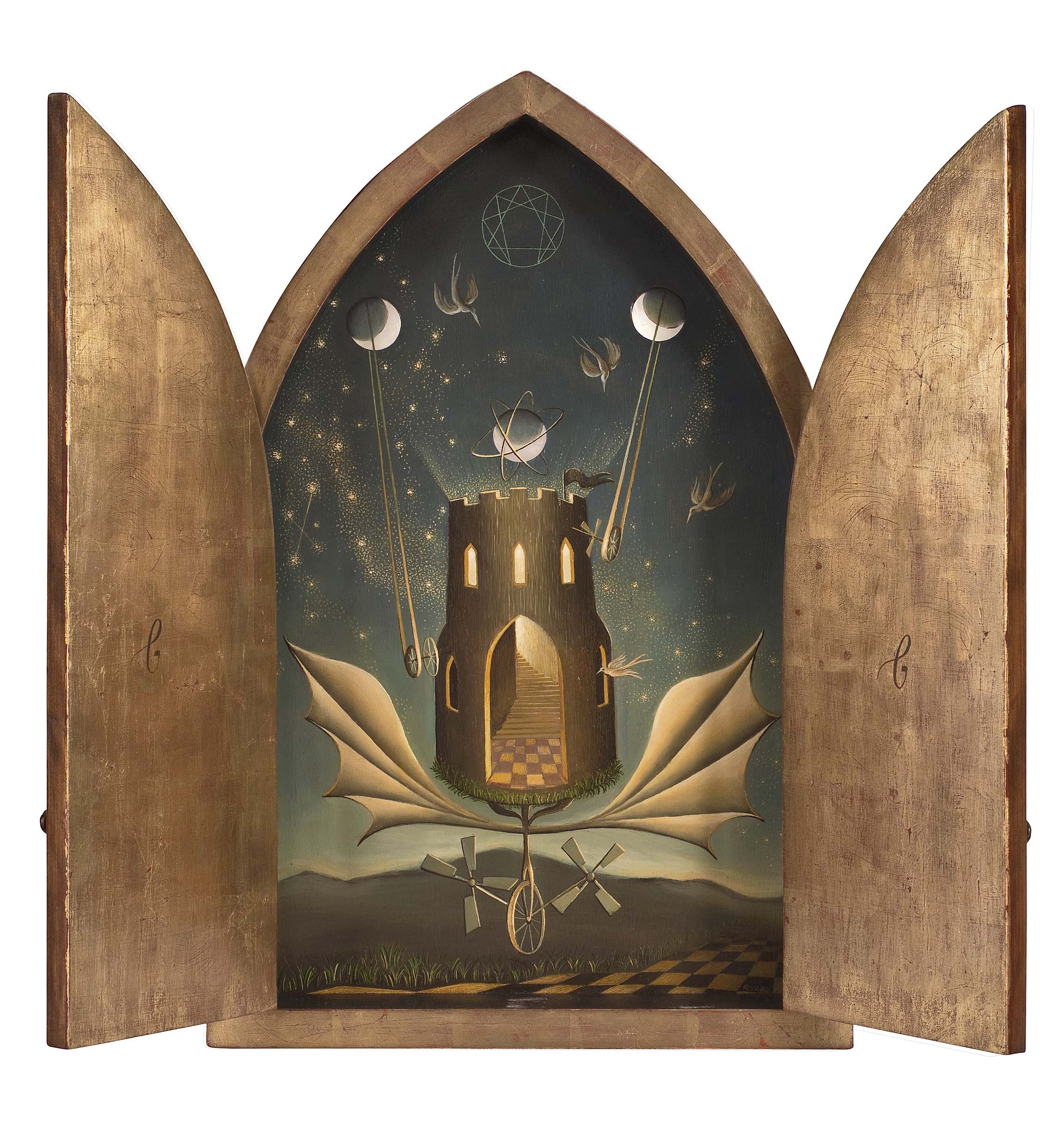 “Icon” by Remedios Varo (Spanish, 1908-1963), 1945, oil with mother-of-pearl and gold leaf inlays on wood. 23⅝ by 15-7/16 by 2⅛ inches, closed; 23⅝ by 27-9/16 by 2⅛ inches, open. Colección Malba. Museo de Arte Latinoamericano de Buenos Aires, 1997.