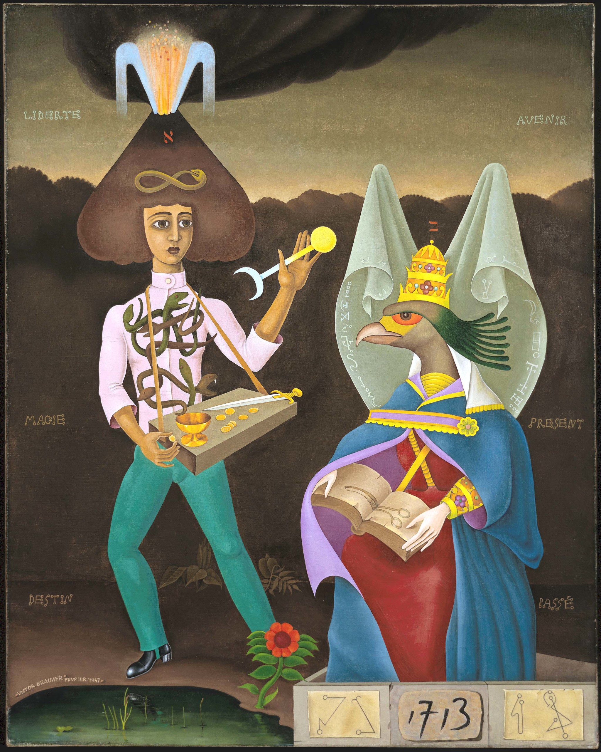 “The Lovers (Messengers of the Number), February” by Victor Brauner (Romanian, 1903-1966), 1947, oil on canvas, 36¼ by 28¾ inches. Centre Pompidou, Musée National d’Art Moderne, Paris: Bequest of Madame Jacqueline Victor Brauner, 1986.