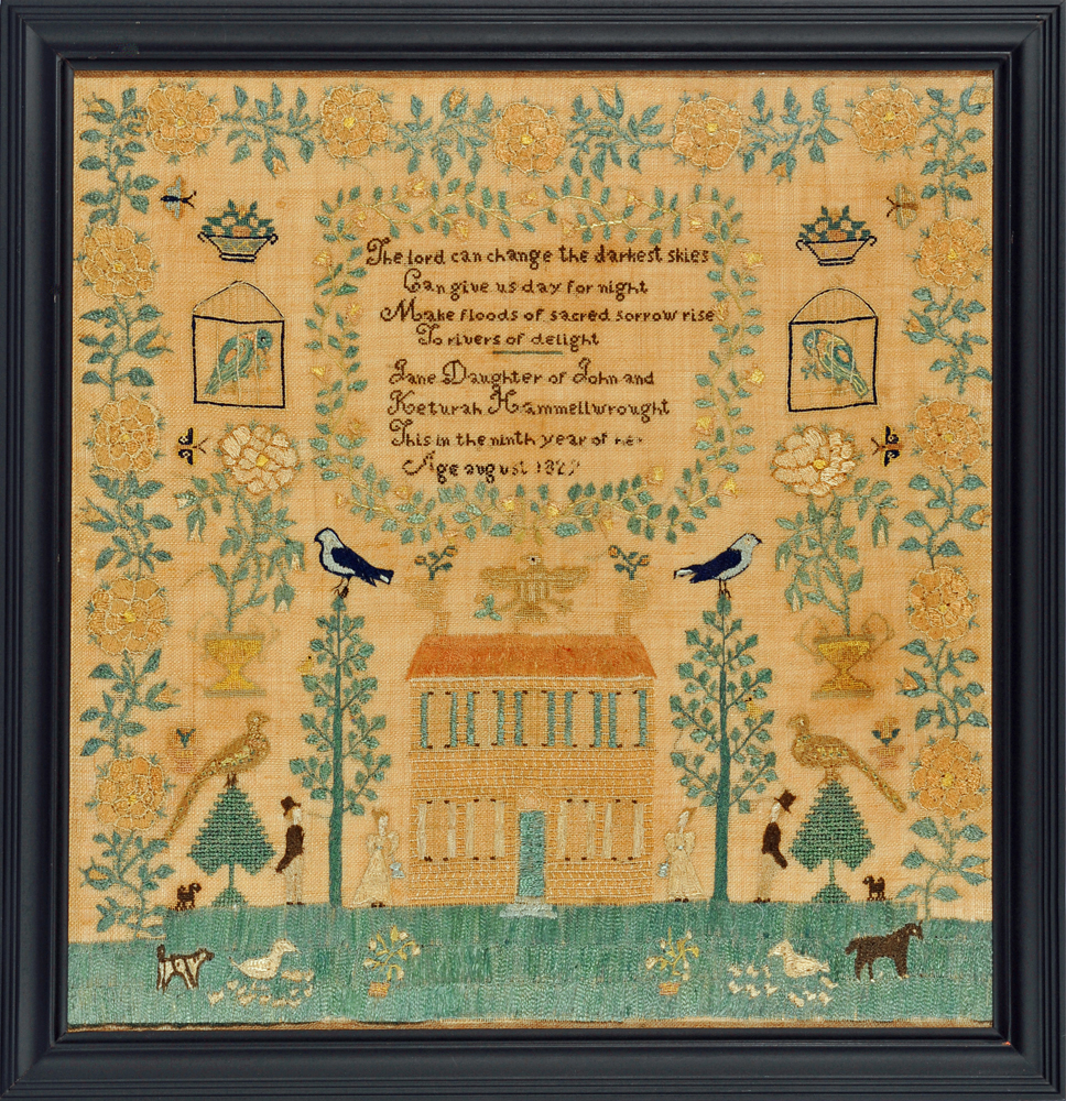 JANE HAMMELL Burlington County, NJ 1829 Jane, aged 9, stitched one of the most exciting samplers worked in Burlington County. Her twin sister Elizabeth, made an almost identical piece the same year. They both fea-ture a spread eagle over a center hall house with vivid flowers, parrots in cages, birds perched on trees, people and animals. Jane enhanced her sampler with an uplifting verse from an Isaac Watts hymn. Jane and Elizabeth, born in 1820, were two of fourteen children born to John Hammell and his second wife Keturah Leeds. They lived on a farm in Mansfield Township, Bur-lington County, NJ. Neither of the girls married and were listed as school teachers in the 1870 census. Silk on linen; 17 1/2 x 16 3/4 inches sight.