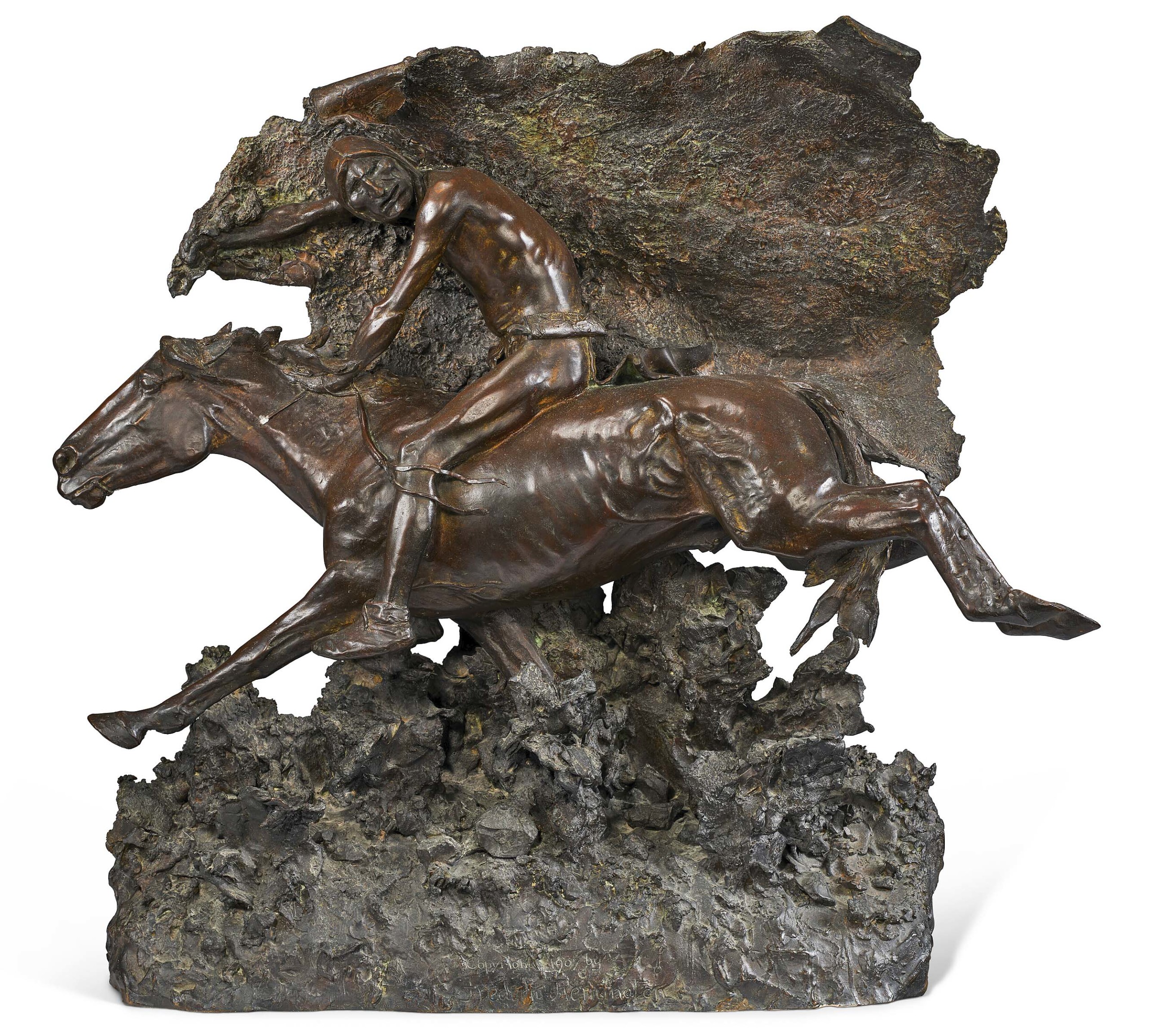 “The Horse Thief” by Frederic Remington (1861-1909), copyright 1907, bronze with brown patina, stamped with Roman Bronze Works NY foundry mark, 27 inches high ($3/5,000,000). Photo courtesy Christie’s Images.