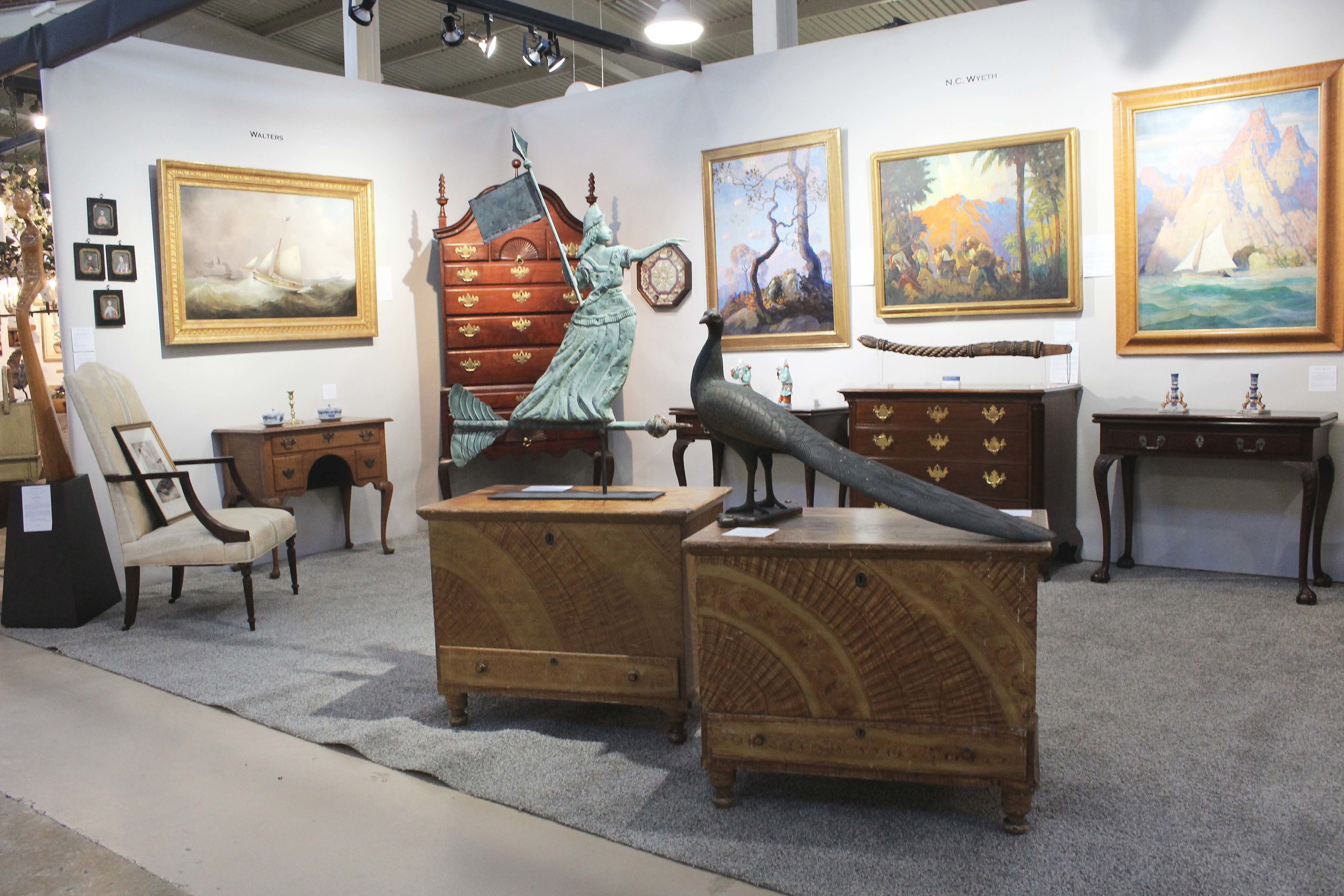 Freitas’ highly curated booth offered a mix of Americana, paintings and furniture. Offerings ranged from a finely carved and painted peacock from Maine, circa 1880, set on a base, that was turning heads to a late Nineteenth Century Goddess of Liberty weathervane in molded copper, attributed to William G. Henis, Philadelphia. Among furniture highlights was a rare Chippendale carved and figured walnut bonnet-top highboy from Salem, Mass., circa 1765.