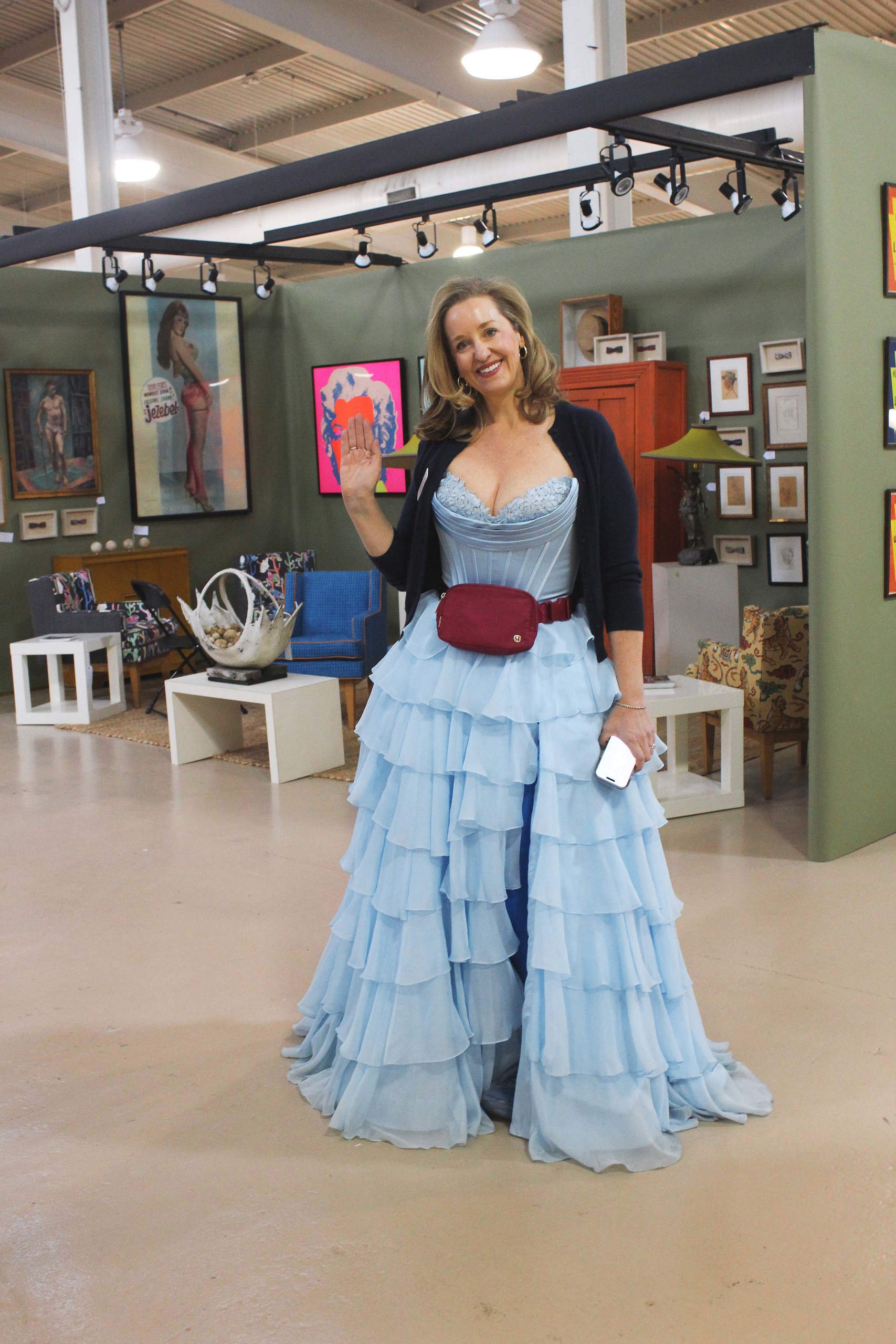 Considering Currier was running her first ever antiques show, she pulled off what some dealers called a miracle, taking this event from an idea sketched out on her kitchen table in August to a fully realized show in January. The show looked like most other antiques shows at first glance, with carpeted and walled booths, but the 3D moon photo backdrop at the front of the show and the food trucks in back hinted at the show’s fresh vibe. A magician wandered around the show, delighting showgoers with card tricks and other feats. Chair massages were offered, and there was a “Richmond Loves You” graffiti wall where showgoers could add their mark. To incentivize buyers, Currier also gave out gift certificates. Several dealers wholeheartedly embraced the mood and aesthetics. Bachelor hill antiques (Elkin, N.C.) created a fun booth with pops of color from a pair of wing back chairs, originally made for a Virginia library, that were given new life with a bold blue fabric; a one-door cupboard in rusty-orange paint; and a pair of artworks after Warhol that depicted Marilyn Monroe with colors practically vibrating out of their frames.