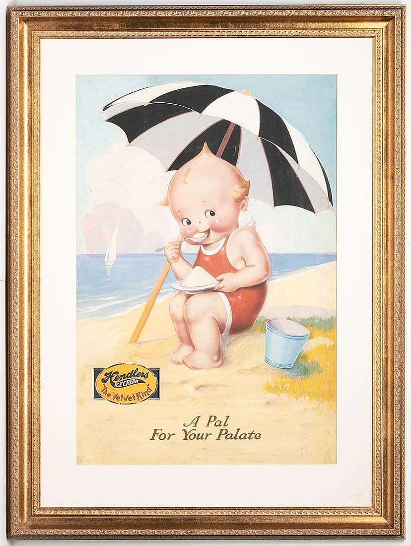 Works of art on paper were topped by an original oil illustration by Rose Cecil O’Neill, the creator of the Kewpie doll and characters. Titled “A Pal For Your Palette,” the circa 1925 work was apparently commissioned by the Hendler Ice Cream Company and purportedly originally came from the Hendler family estate in Baltimore, according to catalog notes. Previously auctioned by Soulis in 2003, it sold for $16,520 this time around and was the second-highest price of the sale. Soulis commented that it “was pursued by members of the International Rose O’Neill Collector’s Foundation and was presumably won by one of them.”