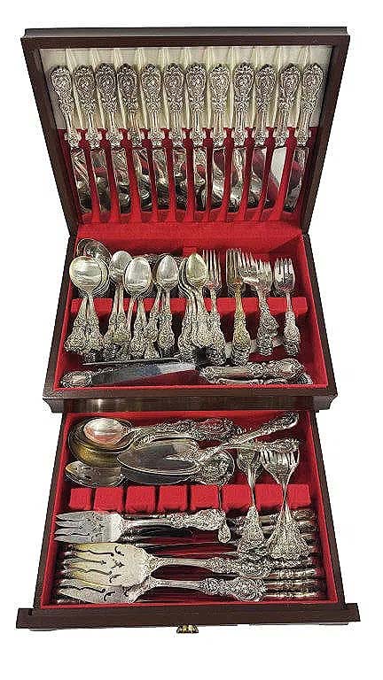 Crossing the block at $17,500 was this massive 161-piece sterling silver flatware set by Reed & Barton in the Francis I pattern, 255 troy ounces ($6/9,000).
