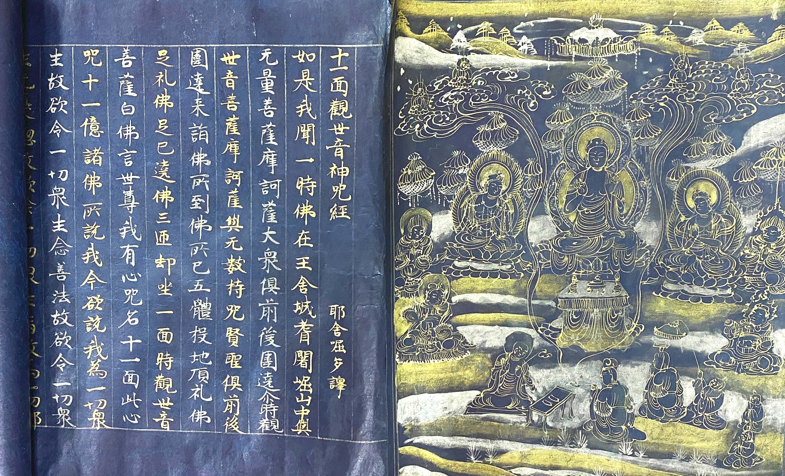 A portion of a Buddhist scroll (sutra), the Eleven-Faced Avalokitsvara Heart Dharani Sutra, from the Twelfth Century Chūsonji sutras.