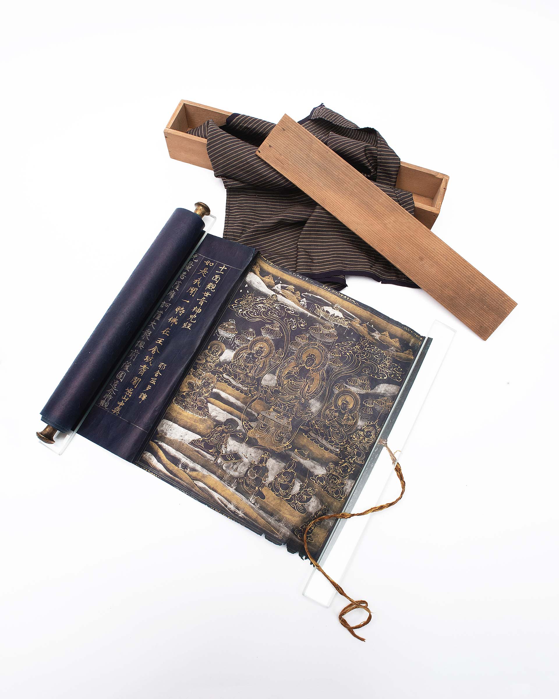 Twelfth Century Chūsonji Buddhist scroll (sutra) with its original storage box and silk wrapper, from the time of its acquisition in Kyoto, in 1919.