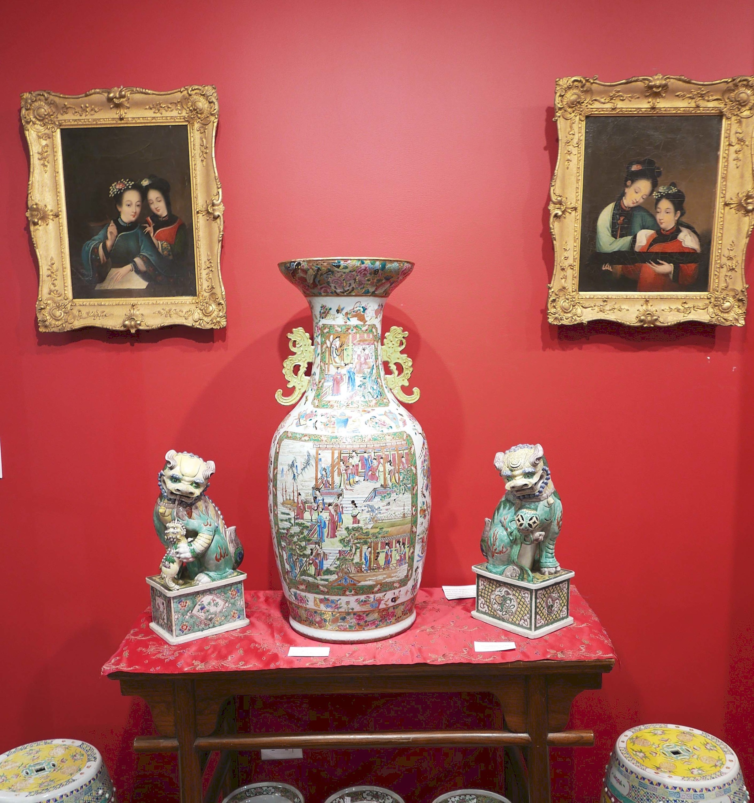 Mostafa Hassan of Imperial Oriental Art chose this curated display as some of his best pieces: a pair of oil on canvas portraits, each of two young women, Retainging period, attributed to Youqua (Chinese, active 1804-1870); a pair of brightly glazed Buddhist lions from the Kangzi Period (1662-1722); and a “massive” famille-rose Canton enamel vase with dragon handles from the early Nineteenth Century.