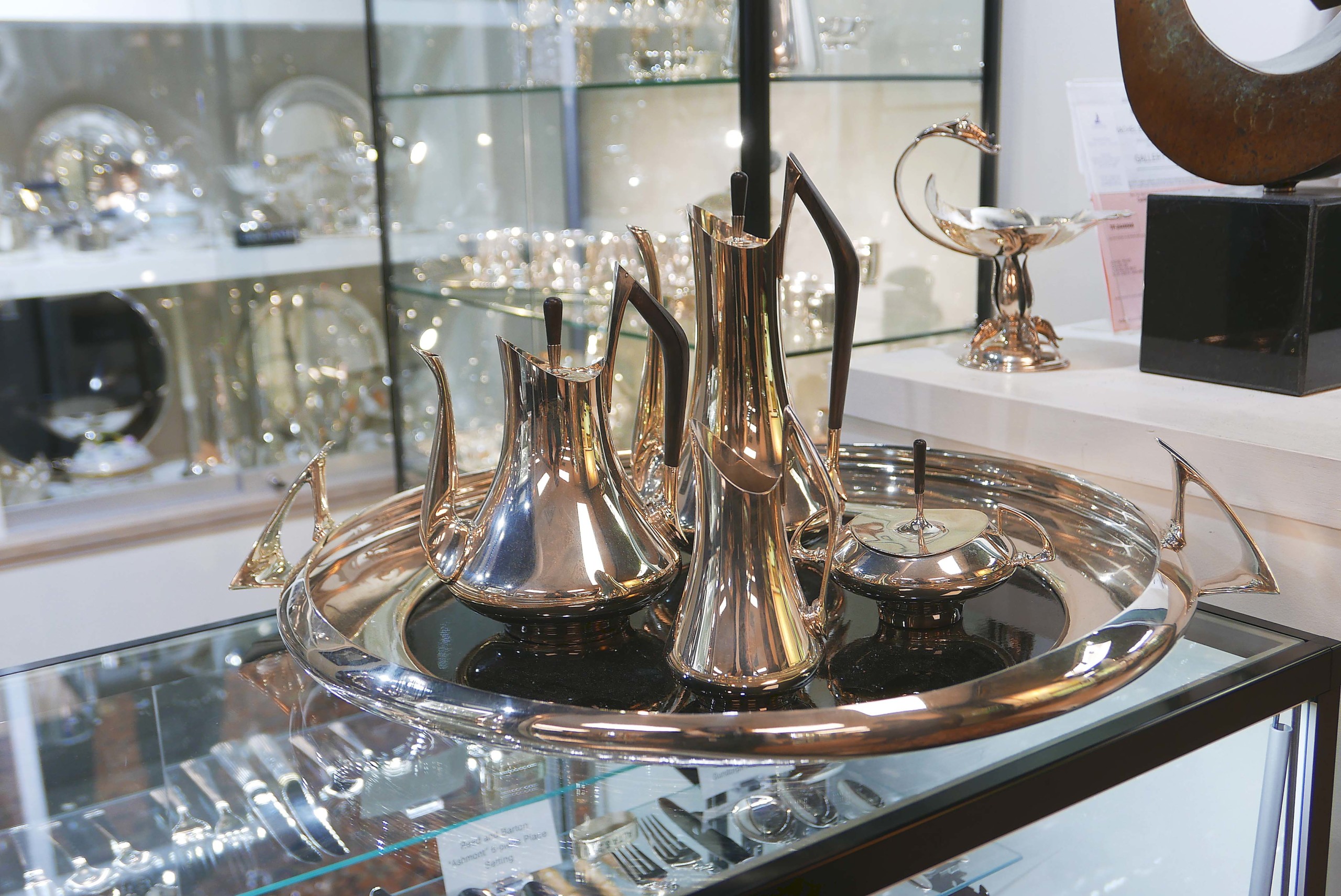 Rachel Prater, founder of Gallery 925, has a passion for Georg Jensen, though she had other silver offerings available as well, such as this five-piece Gorham coffee and tea set in a Modernist design by Donald Colflesh, circa 1958, that had ebony details.