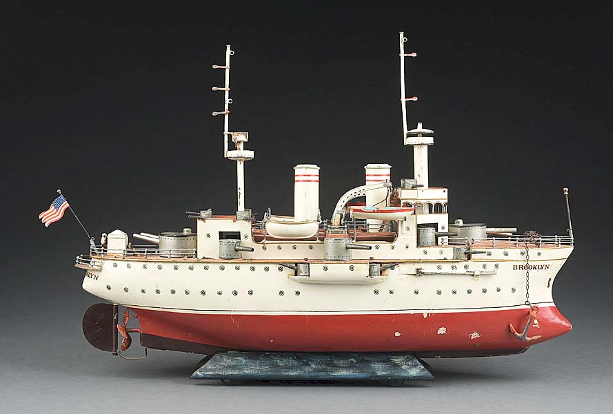 This Märklin hand-painted, clockwork-powered Brooklyn battleship (Cat. Ref. 5120), 25½ inches, sold for $56,580 against an estimate of $30/50,000. Its line of provenance included the collection of publishing magnate Malcolm Forbes.
