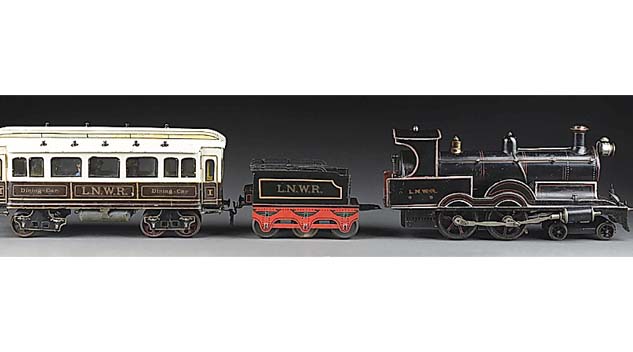 Selling for $123,000, this rare circa-1904 Märklin hand-painted III-gauge live steam LNWR locomotive (Cat. Ref. E4023), tender and dining car (Cat. Ref. 1842/3) was one of the best toy trains in the Sage collection ($50/70,000).