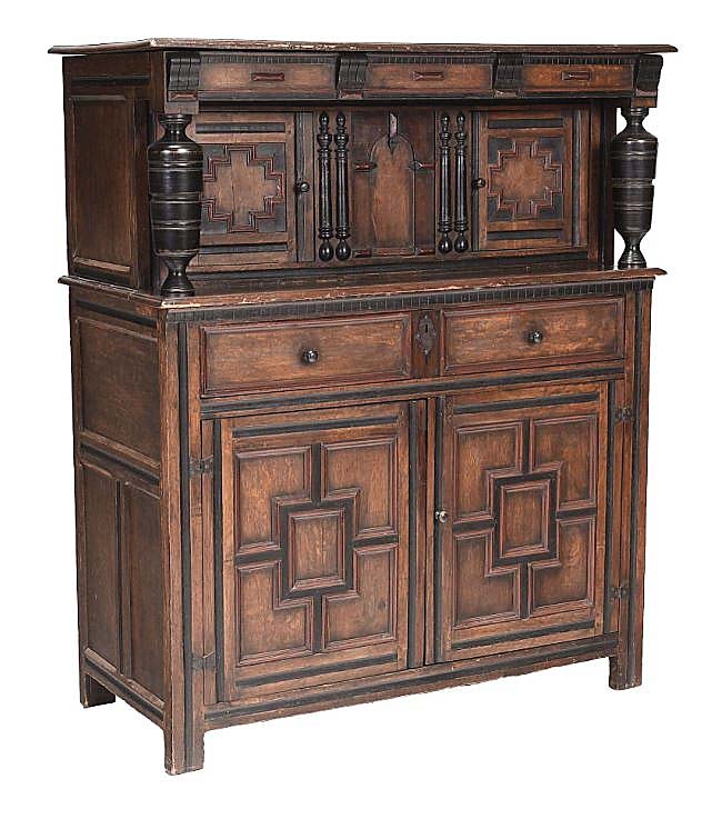 A private collector making their buying debut at the house pushed interest in this American Pilgrim Century painted and ebonized oak court cupboard, from the Vander Sande collection, to $44,280 ($5/7,000).