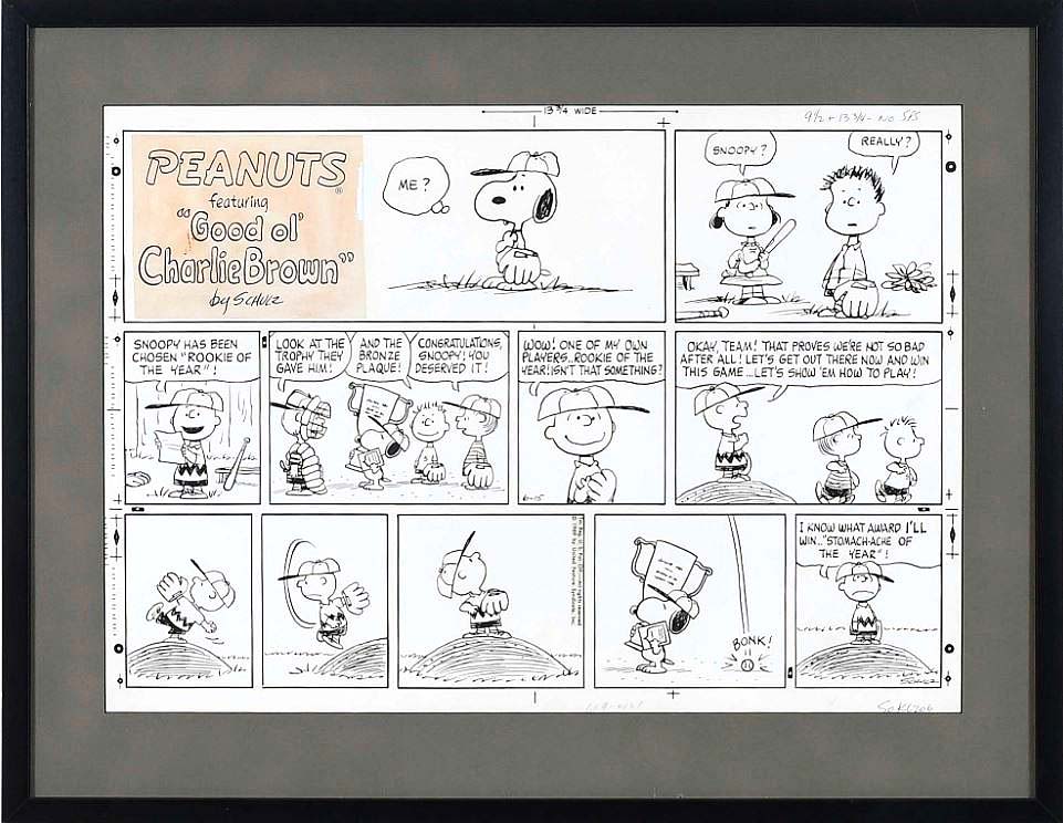 Published June 15, 1969, this Peanuts cartoon strip, titled “Rookie of the Year” featured the final official appearance of the character Shermy and sold, to an institution making their debut purchase at Brunk, for $54,120. The strip was one of four originally owned by United Feature Syndicate editor Jim Freeman ($30/50,000).