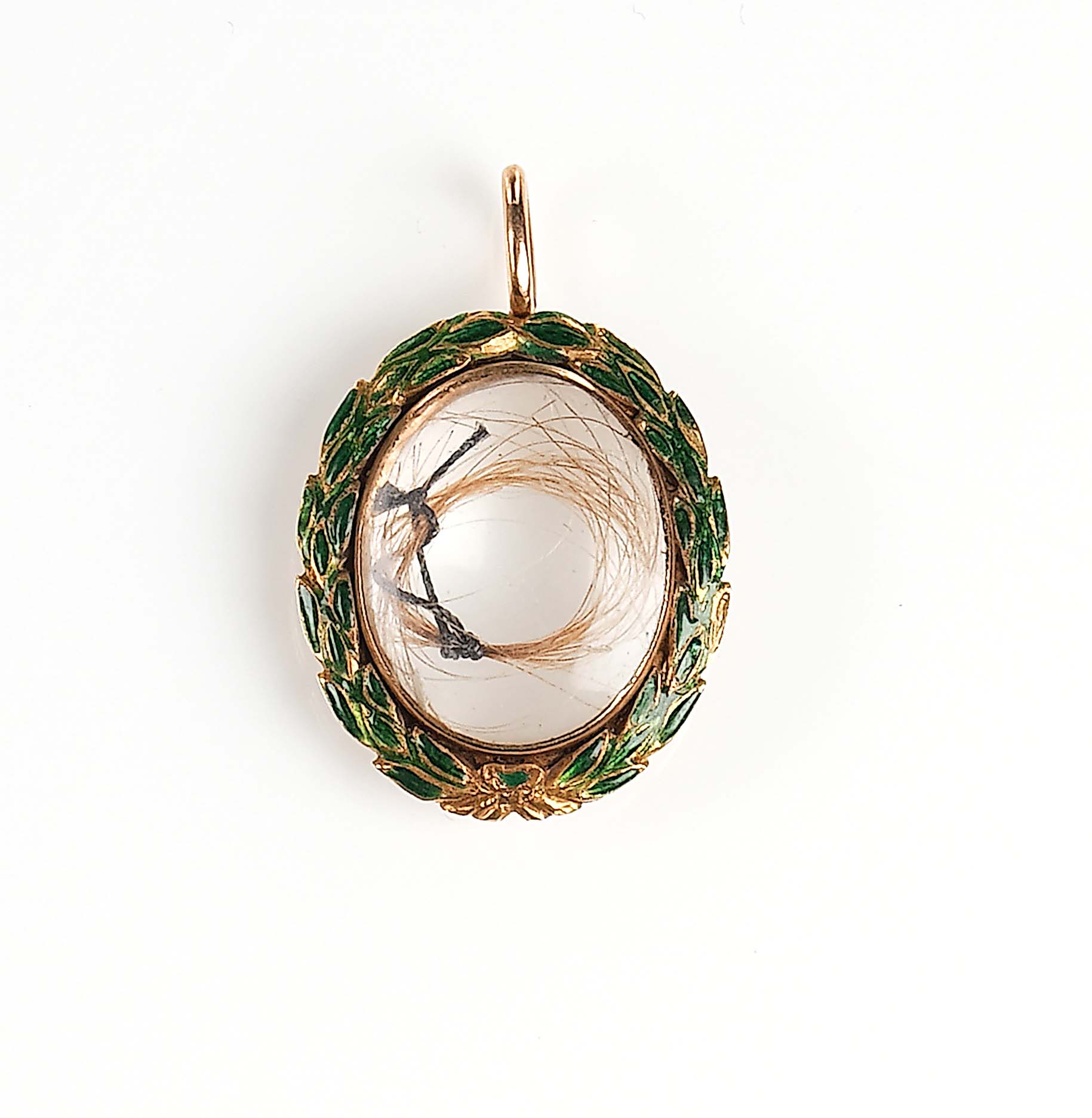 Pendant with medallion encasing the hair of Wolfgang Amadeus Mozart and Ludwig van Beethoven (1770-1827), Vienna, mid Nineteenth Century, enamel, glass and gold with hair.International Mozarteum Foundation Salzburg, Mozart Museums.