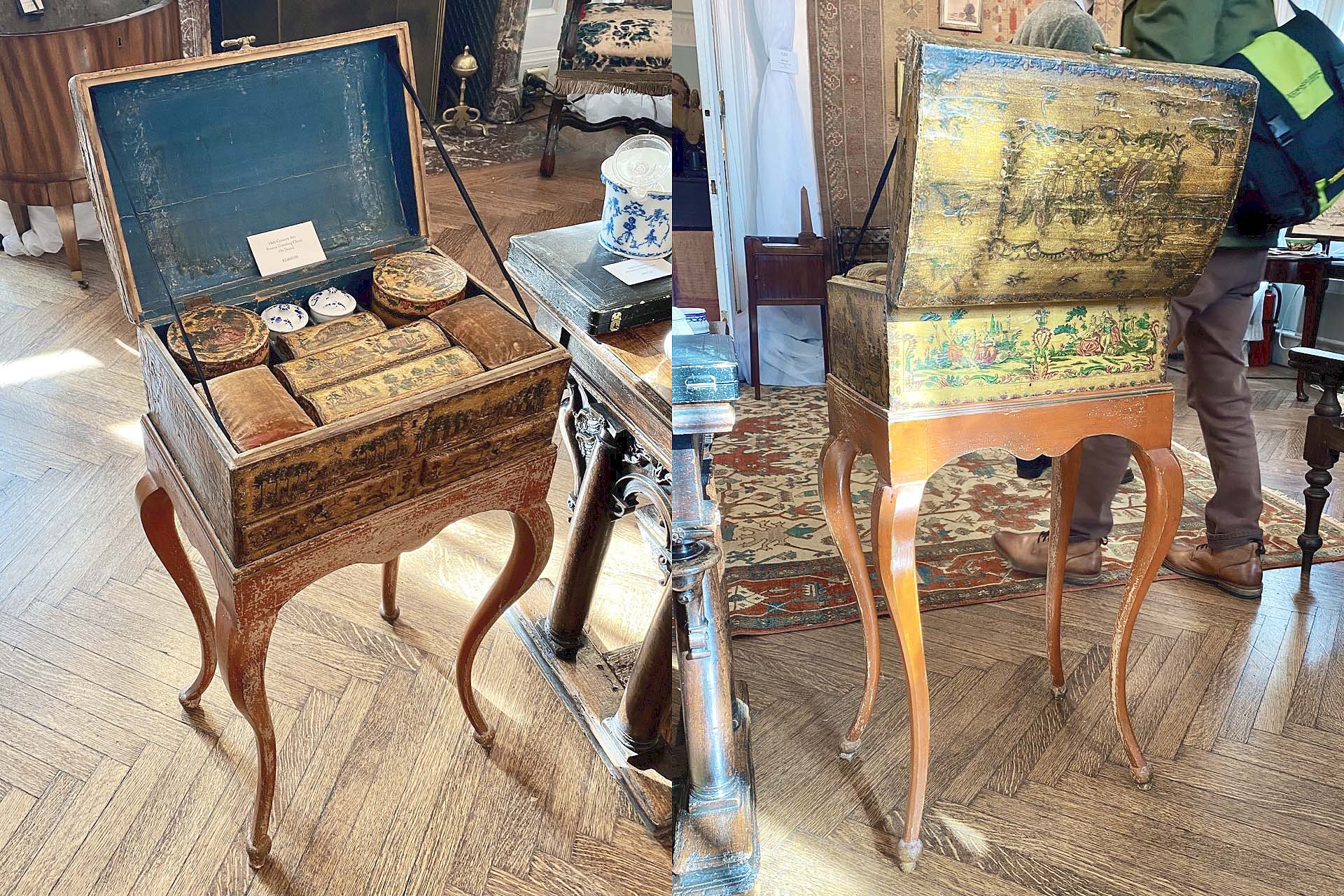 Made only from wood and paper, this arte povera traveling chest and stand has survived for almost four centuries with all of its interior elements intact. Curio Shop, Brooklyn, N.Y.
