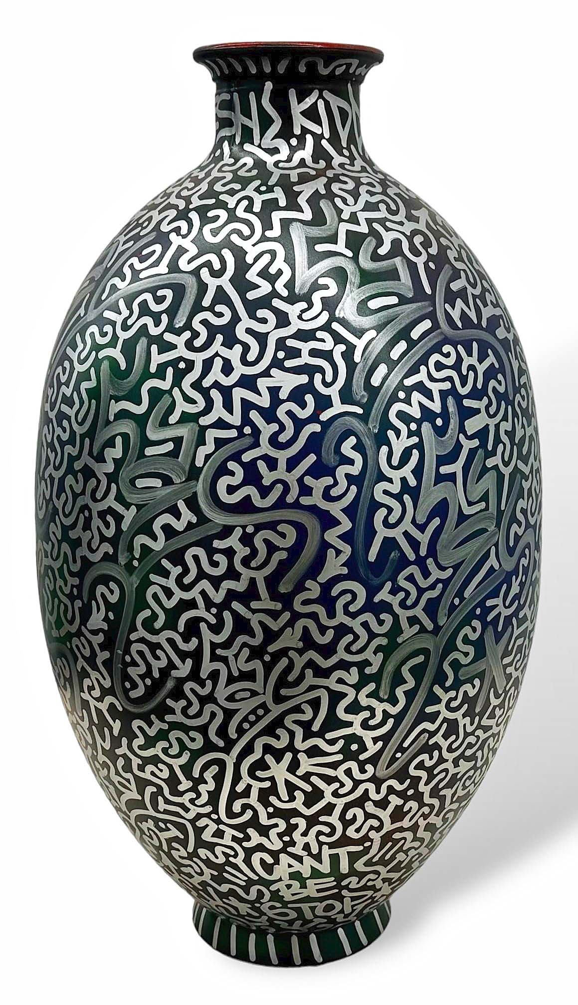 CLINTONDALE, N.Y. — On December 11, Kensington Estate Auctions conducted its Estate Fine Art & Antiques auction. Leading the sale was “Graffiti Vase,” a found glass urn heavily tagged by Angel Ortiz (LA II). The large glass urn measures 23 inches tall and 13 inches wide. LA II’s exceptionally detailed silver metallic paint marker graffiti covers the spray-painted black and purple urn. The urn’s reddish rim is an unmarked highlight. In LA II’s signature style, influenced by frequent collaborator Keith Haring, the graffiti features tight squiggled lines, dots and tagged words such as “Lower East Side” and “Fresh Kids.” The rare addition of the artist’s signature on the underside of the vase helped the piece earn $1,984 with buyer’s premium ($1/2,000). For information, www.kensingtonestateauctions.com or 917-783-1067.