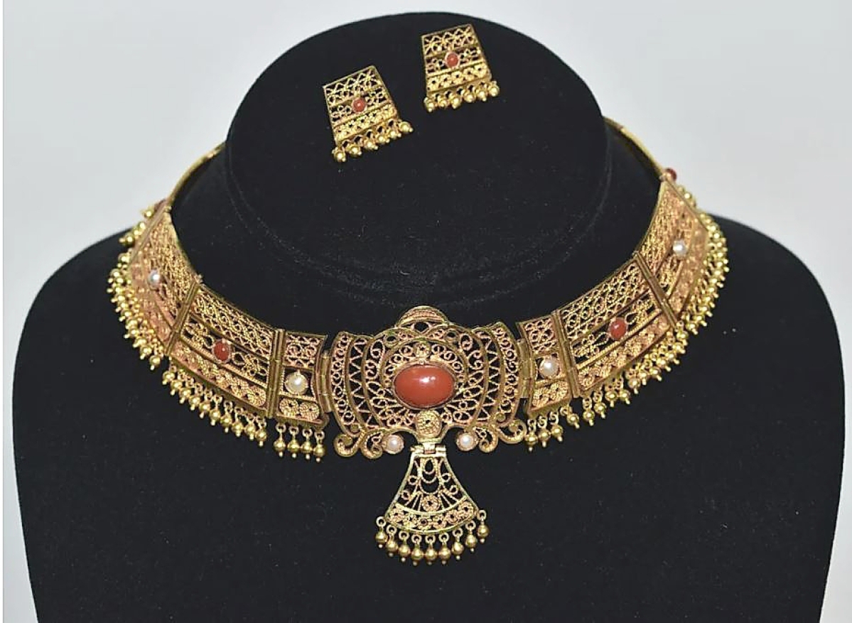 A family’s Indian 22K gold jewelry necklace brought $5,750. The natural pearl/red coral necklace and earrings were circa 1960s. Right behind it in price at $5,375 was a set of Indian 22K yellow gold and Burmese ruby necklace with chandelier earrings, also circa 1960s with approximately 15 carats of Burmese rubies and accompanied by its original Krishmiah Chetty & Sons box.