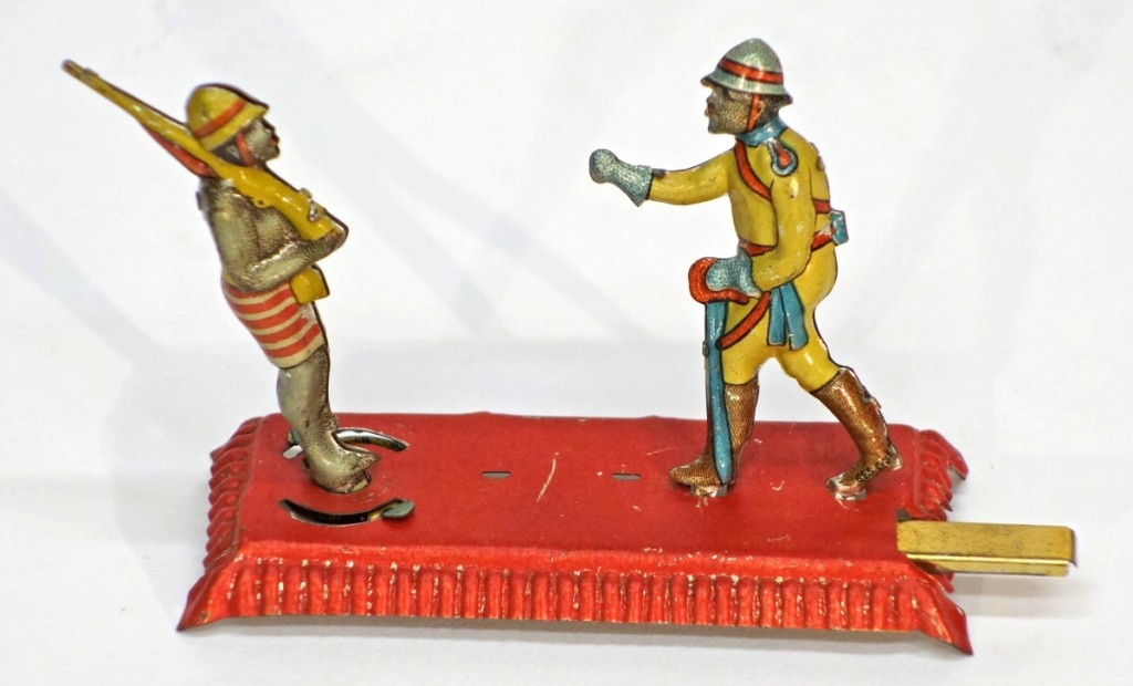 TIMONIUM, MD. – A German penny toy Drill Instructor sold for $3,450 at Richard Opfer’s Eclectic Collector auction on June 15. The mechanical litho tin features a drill instructor and recruit, and when a slide is pushed in, the recruit turns left or right, The 3-inch-high toy was graded VG-EX. With vintage collectibles of all kinds, Opfer’s sale also saw good results by two painted ceramic Austrian Gnomes by Johann Maresch at $2,714, Richter Anchor Building & Pattern Sets fetching $1,380 and a Donkey floor toy with squeaker bringing $978. For information, 410-252-5035 or www.opferauction.com.