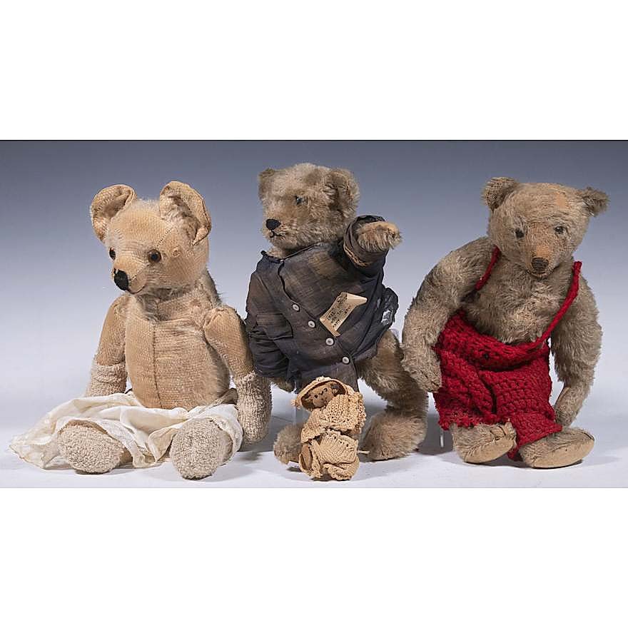 THOMASTON, MAINE — A group of four early mohair teddy bears took the top spot in the Holiday Bling sale conducted by Thomaston Place Auction Galleries on November 29. The largest of the four bears measured 16 inches tall and donned a cotton lace skirt and glass eyes. Two others measured 12 inches tall, one with red knit overalls and another with a navy cotton jumper with a note that read “An Original Roosevelt Bear, made in Germany, around 1900.” Both had bead eyes and were well-loved. The smallest of the four, wearing a crochet outfit and hat, was “doll’s size,” standing at just 4 inches tall. The four bears sold for a total of $1,750 — well above their estimate of $100-300. For information www.thomastonauction.com or 207-354-8141.