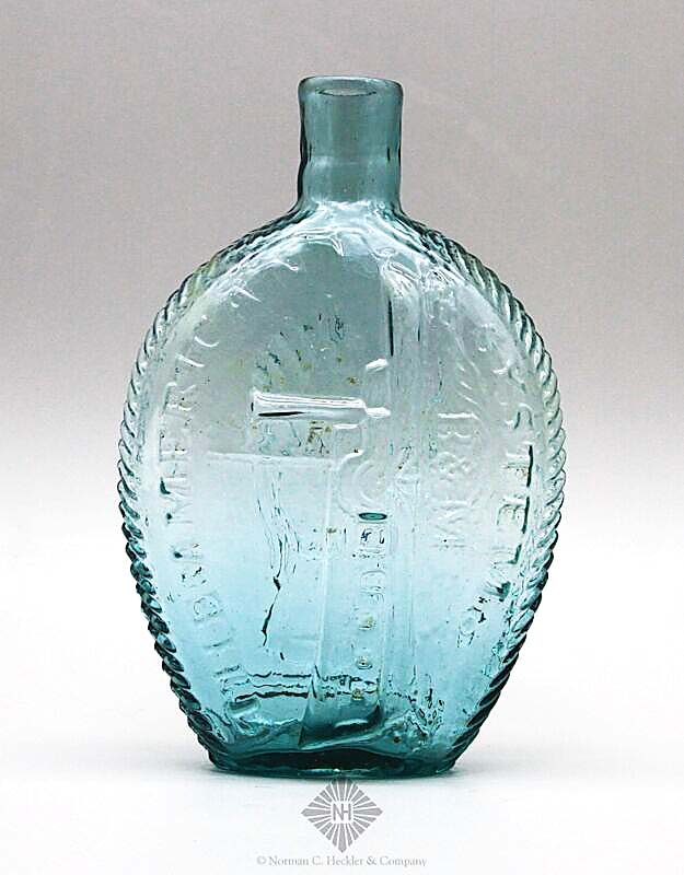 WOODSTOCK, CONN. — Norman C. Heckler & Company’s 249th auction, which closed on October 8, featured 39 “spotlighted selections of exceptional antique historical flasks & bottles.” The leading lot, both in price and in selling order, was an aquamarine historical flask by Baker and Martin, New Boston Glass Works, Perryopolis, Penn. This circa 1820-30 flask was “A new discovery from rural Tennessee passed down through four generations of the family.” One side depicted the steamboat The American System, while the other was embossed with an image of a sheaf of rye. Estimated $15/20,000, it sold for $44,460. For information, www.hecklerauction.com or 860-974-1634.